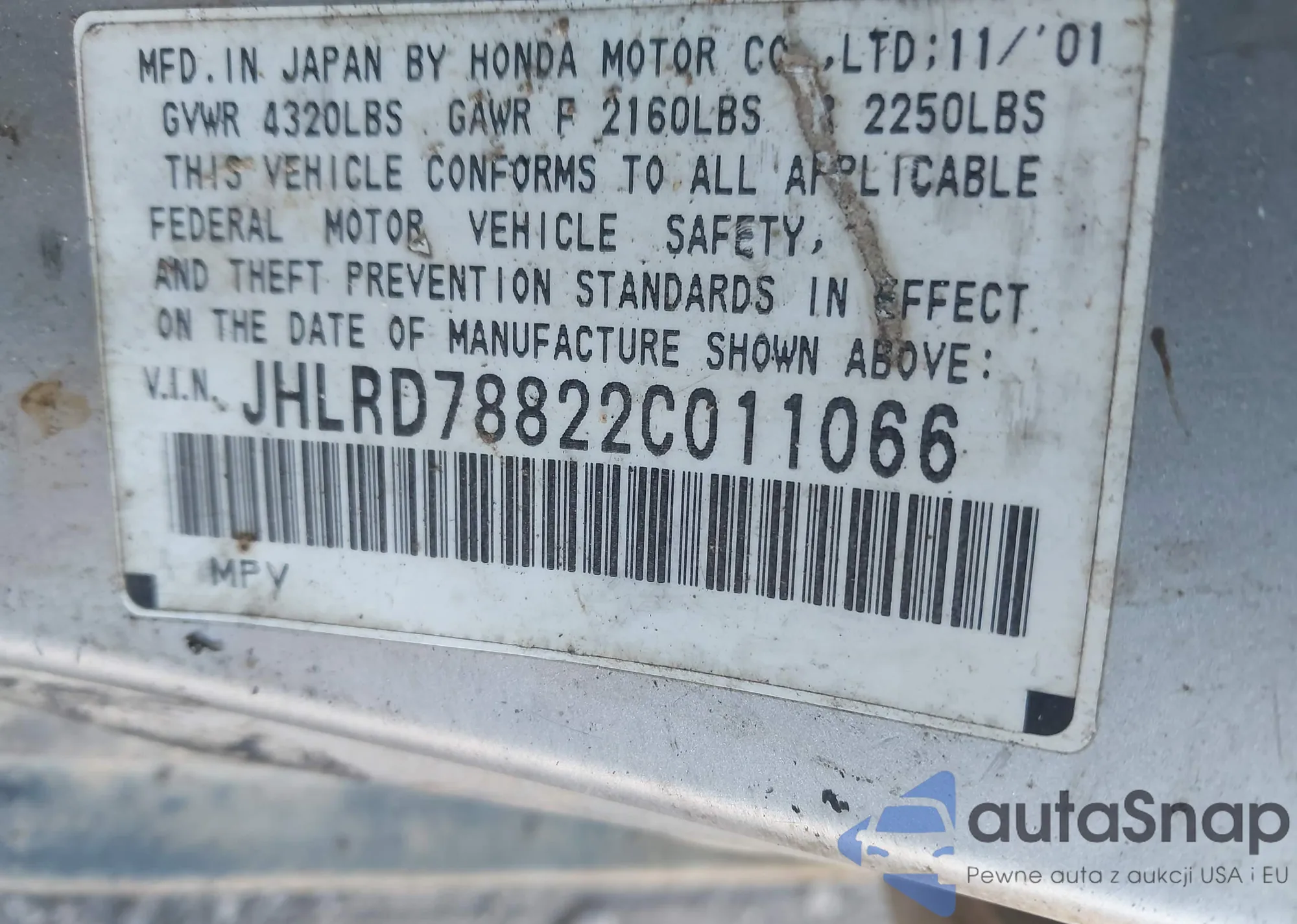 LOT: 43408652 VIN: JHLRD78822C011066