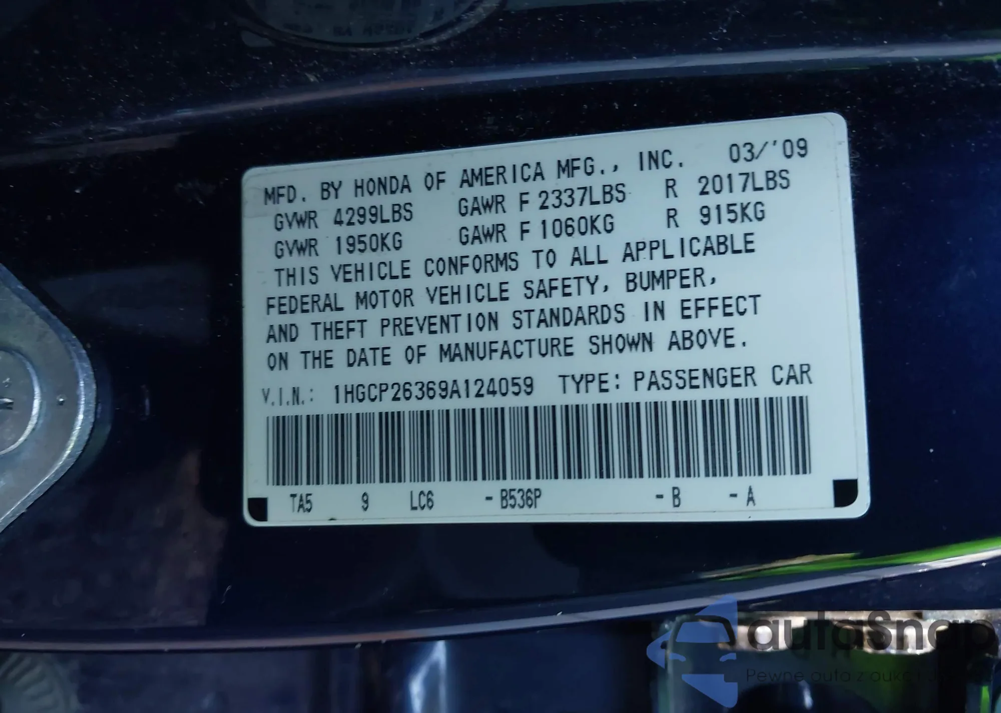 LOT: 43537491 VIN: 1HGCP26369A124059