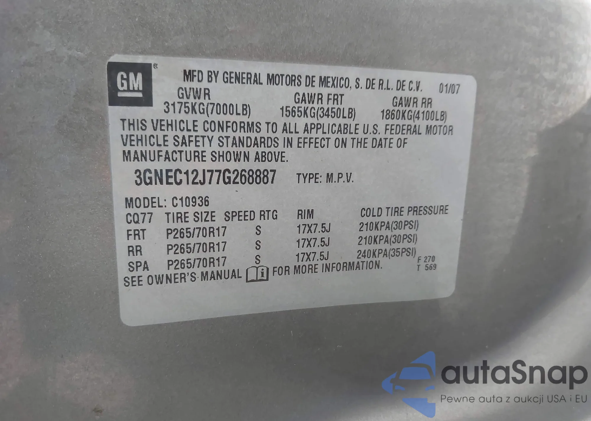 • VIN 3GNEC12J77G268887