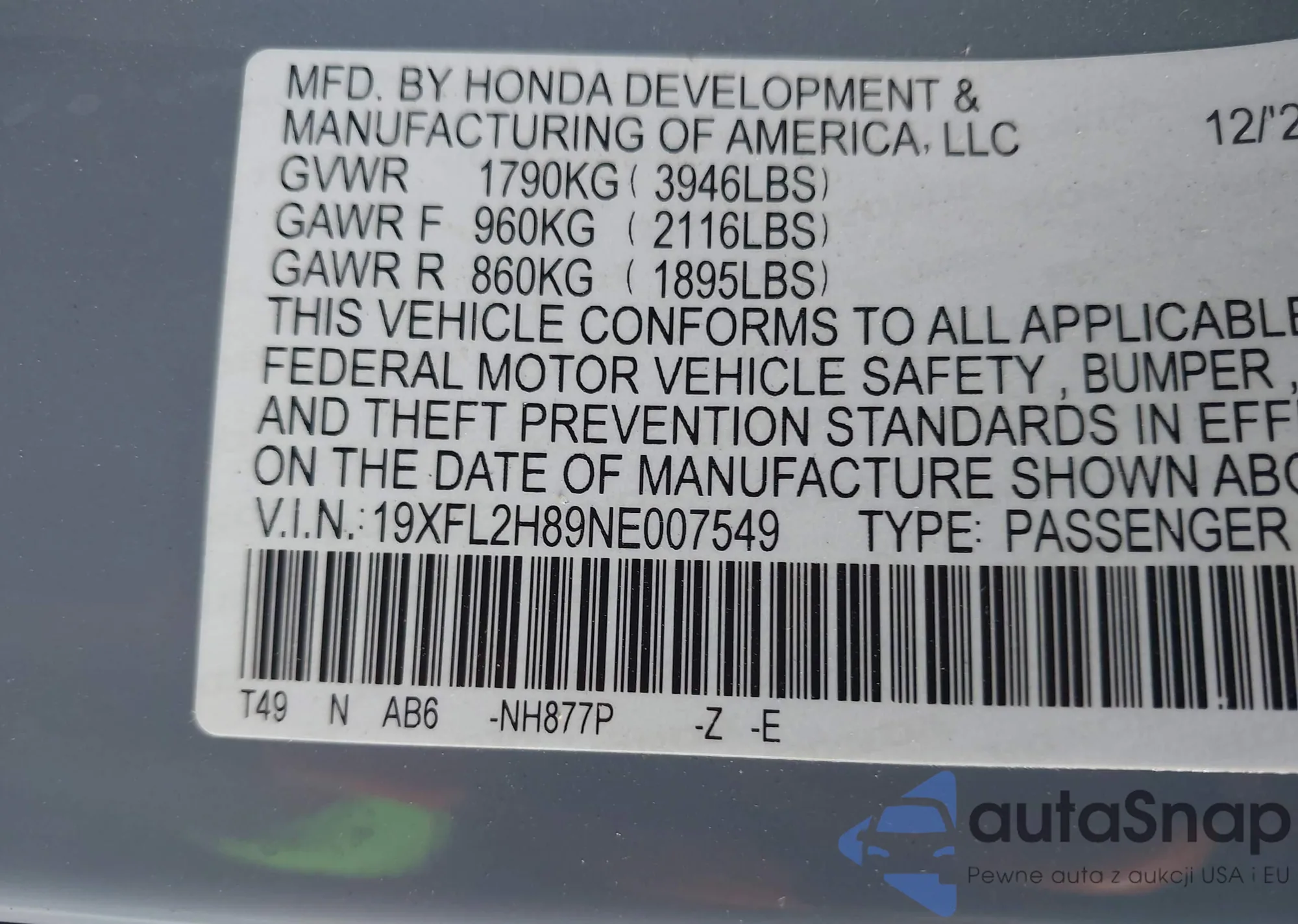 LOT: 43127319 VIN: 19XFL2H89NE007549