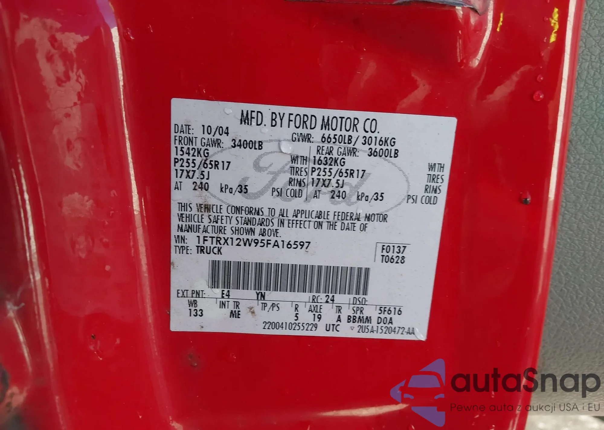 LOT: 43716328 VIN: 1FTRX12W95FA16597