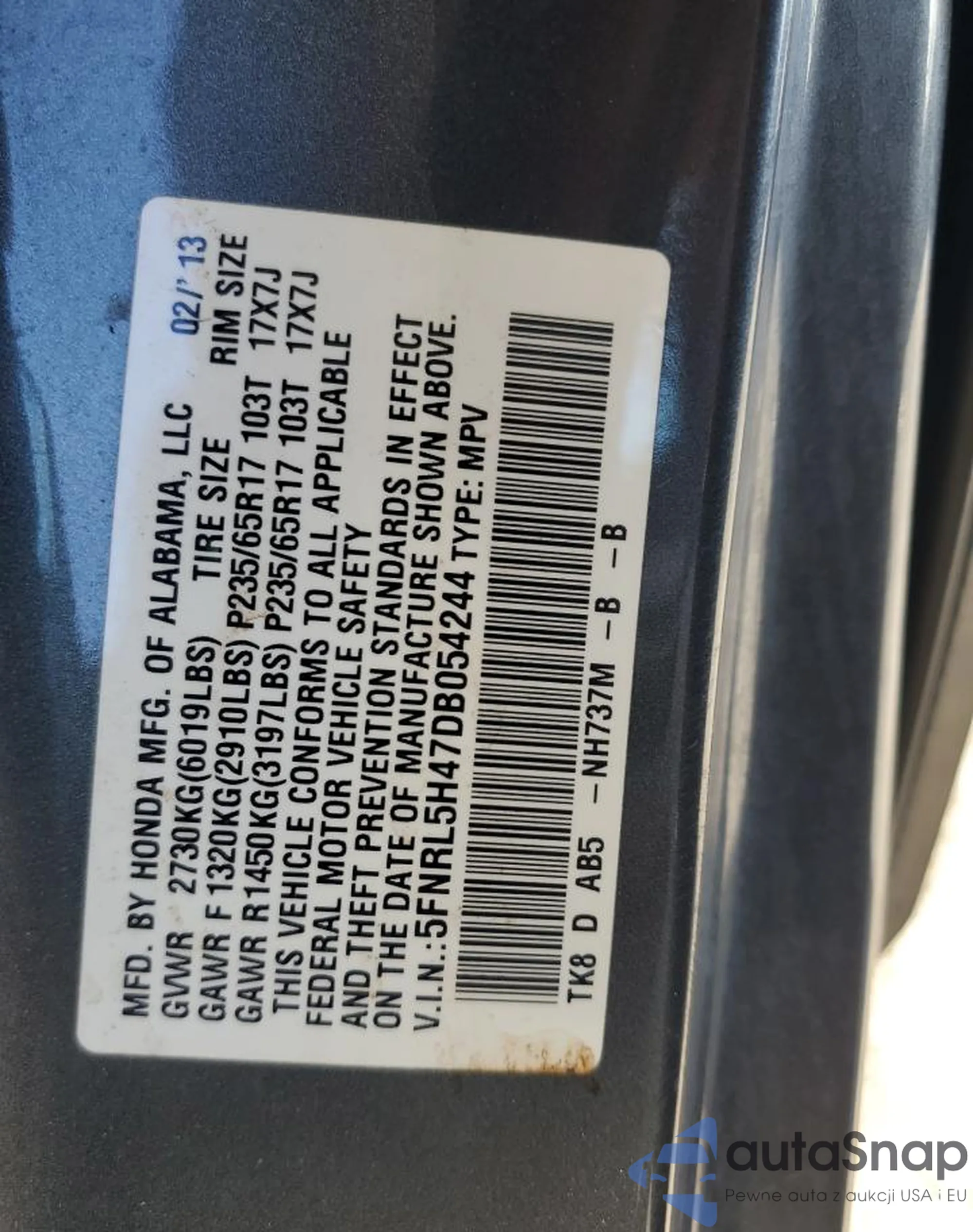 • VIN 5FNRL5H47DB054244