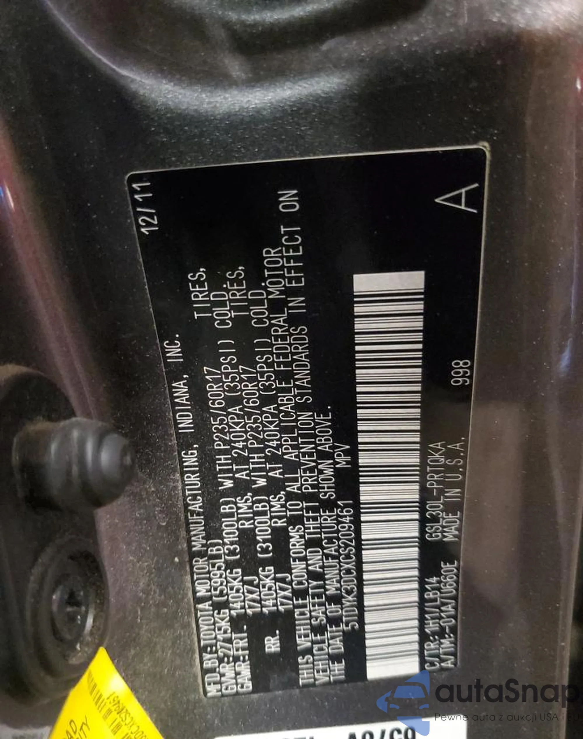 • VIN 5TDYK3DCXCS209461