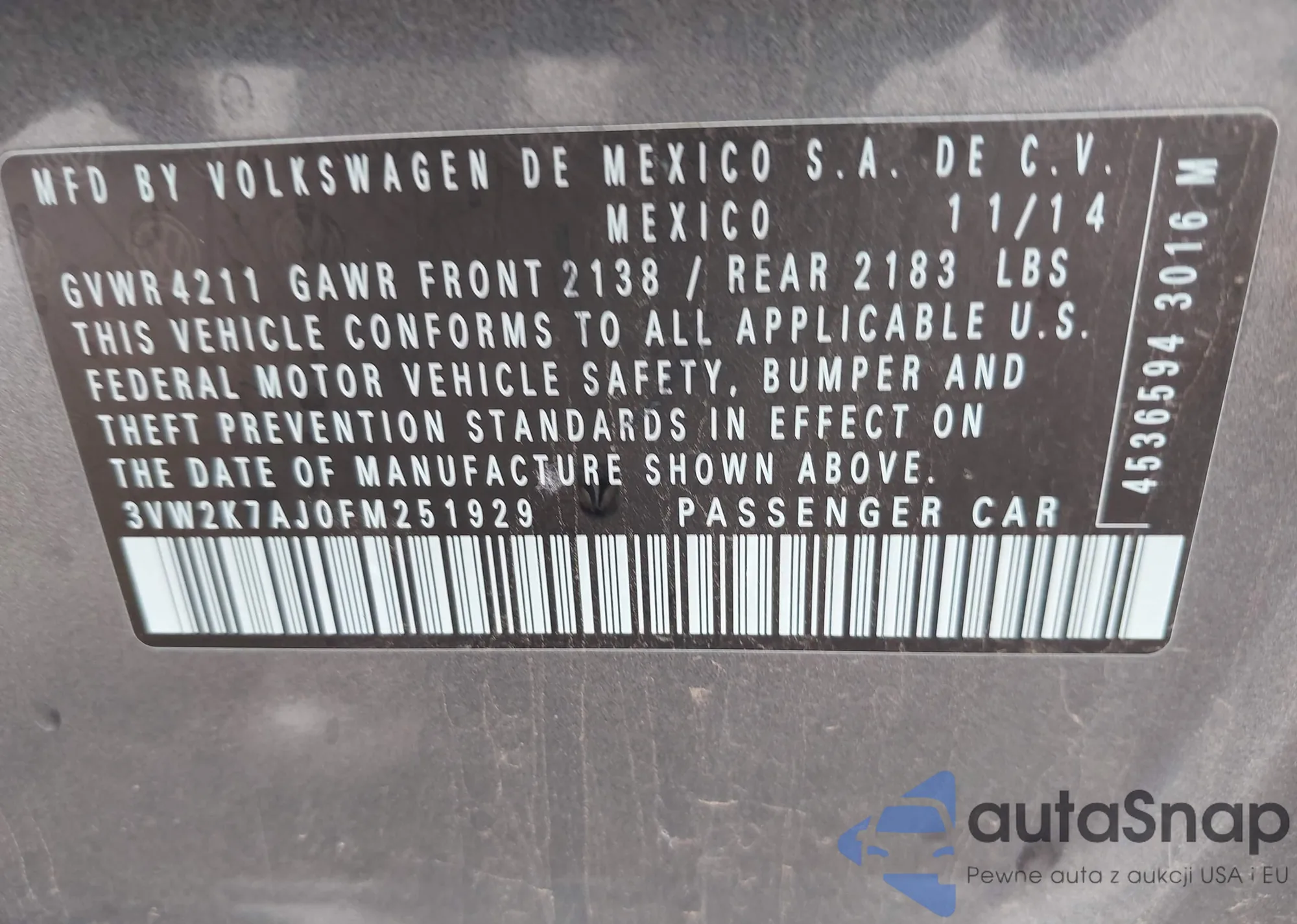 • VIN 3VW2K7AJ0FM251929