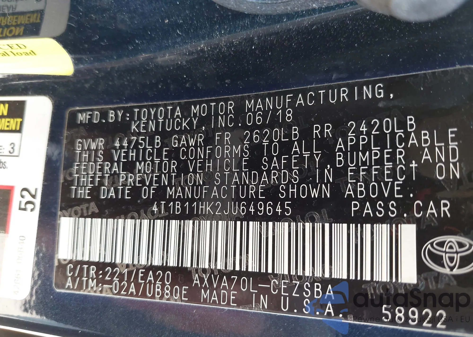 LOT: 43339491 VIN: 4T1B11HK2JU649645