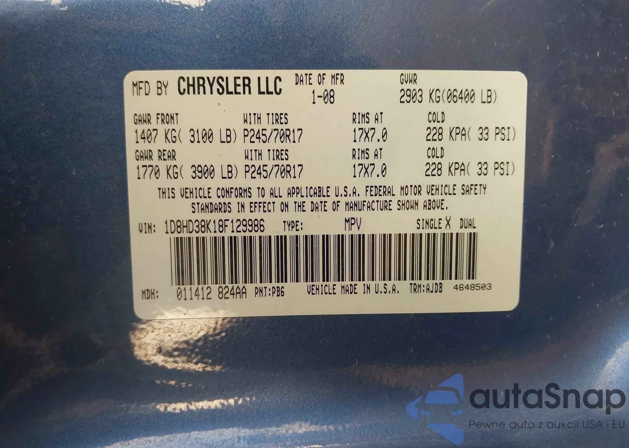 • VIN 1D8HD38K18F129986