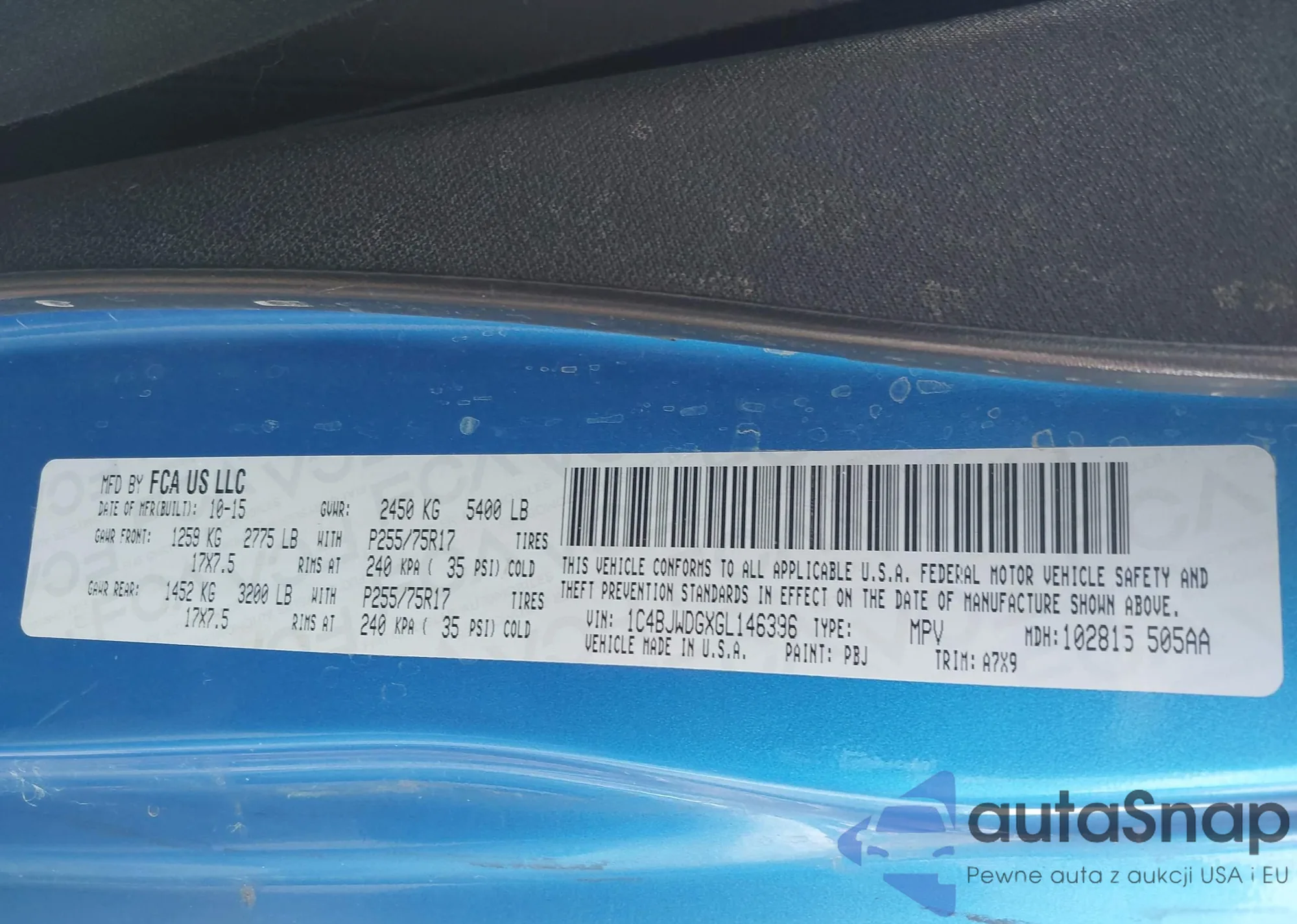 LOT: 43301156 VIN: 1C4BJWDGXGL146396