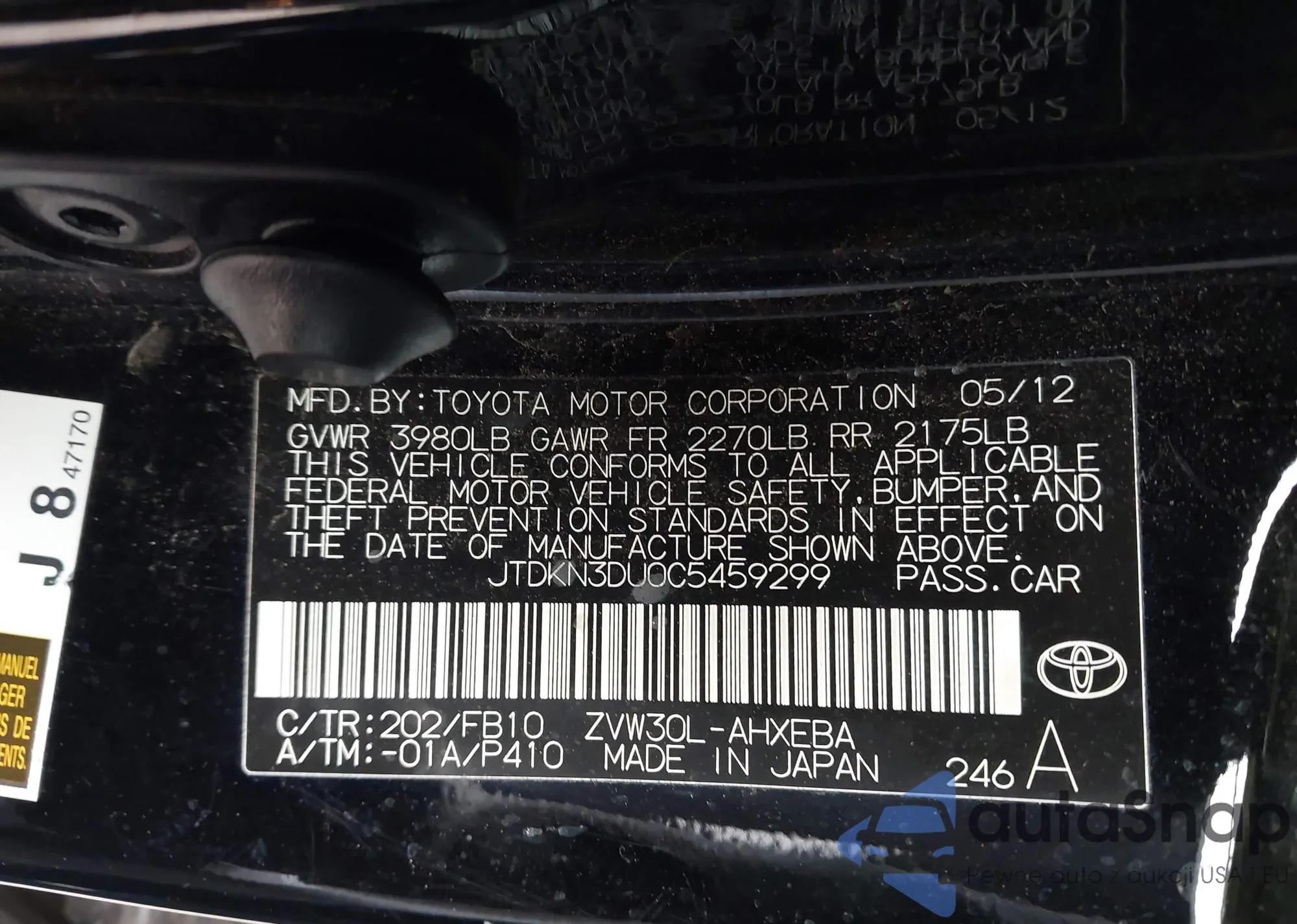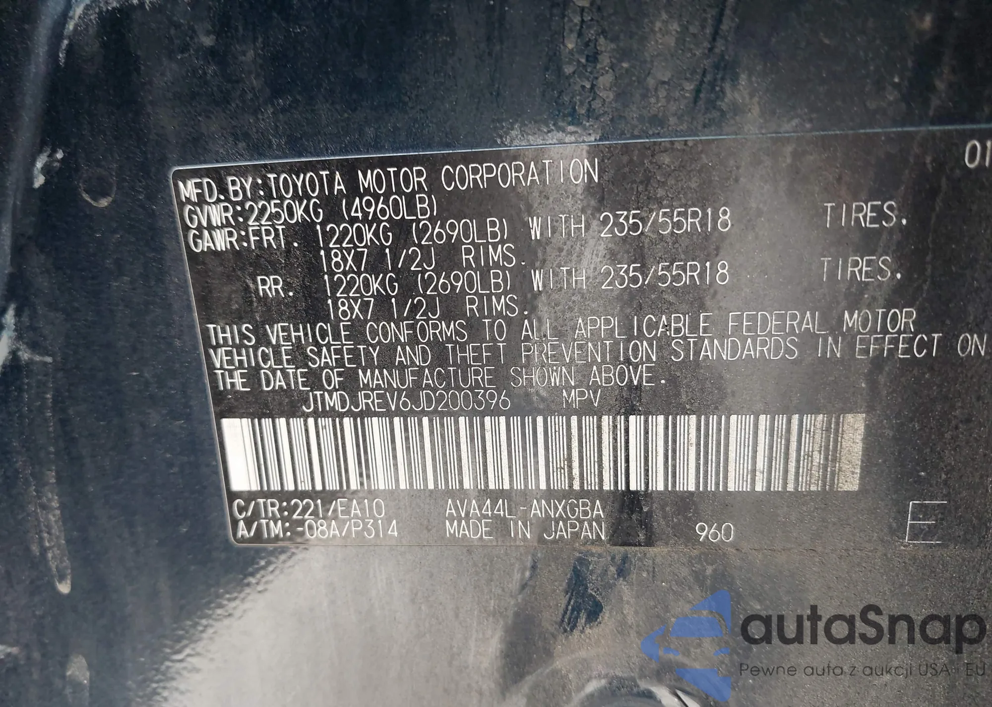 LOT: 43309583 VIN: JTMDJREV6JD200396