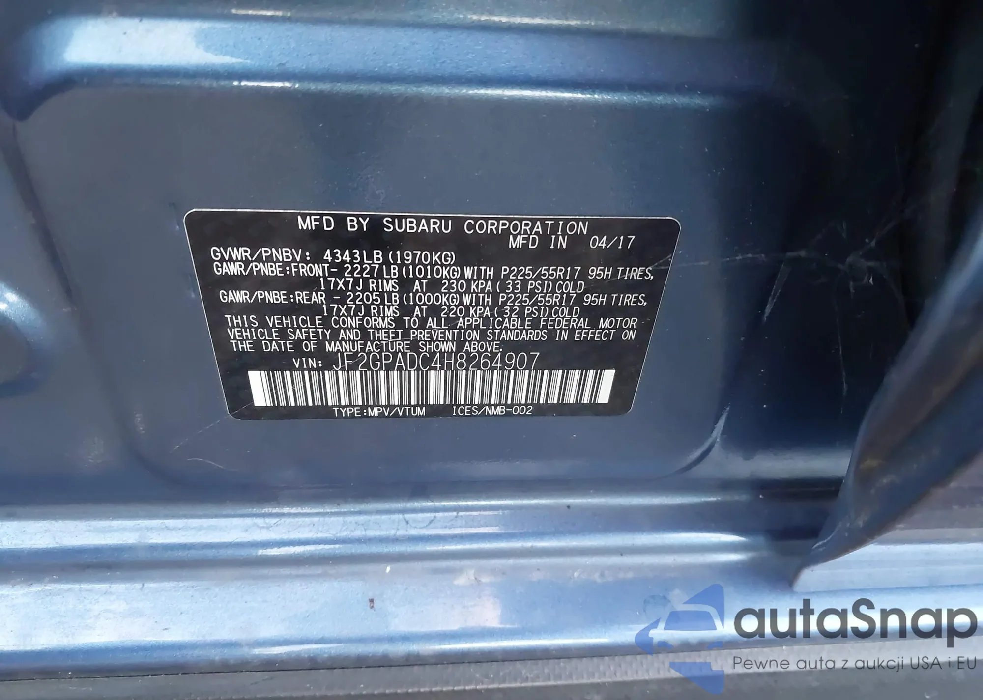 LOT: 43499251 VIN: JF2GPADC4H8264907
