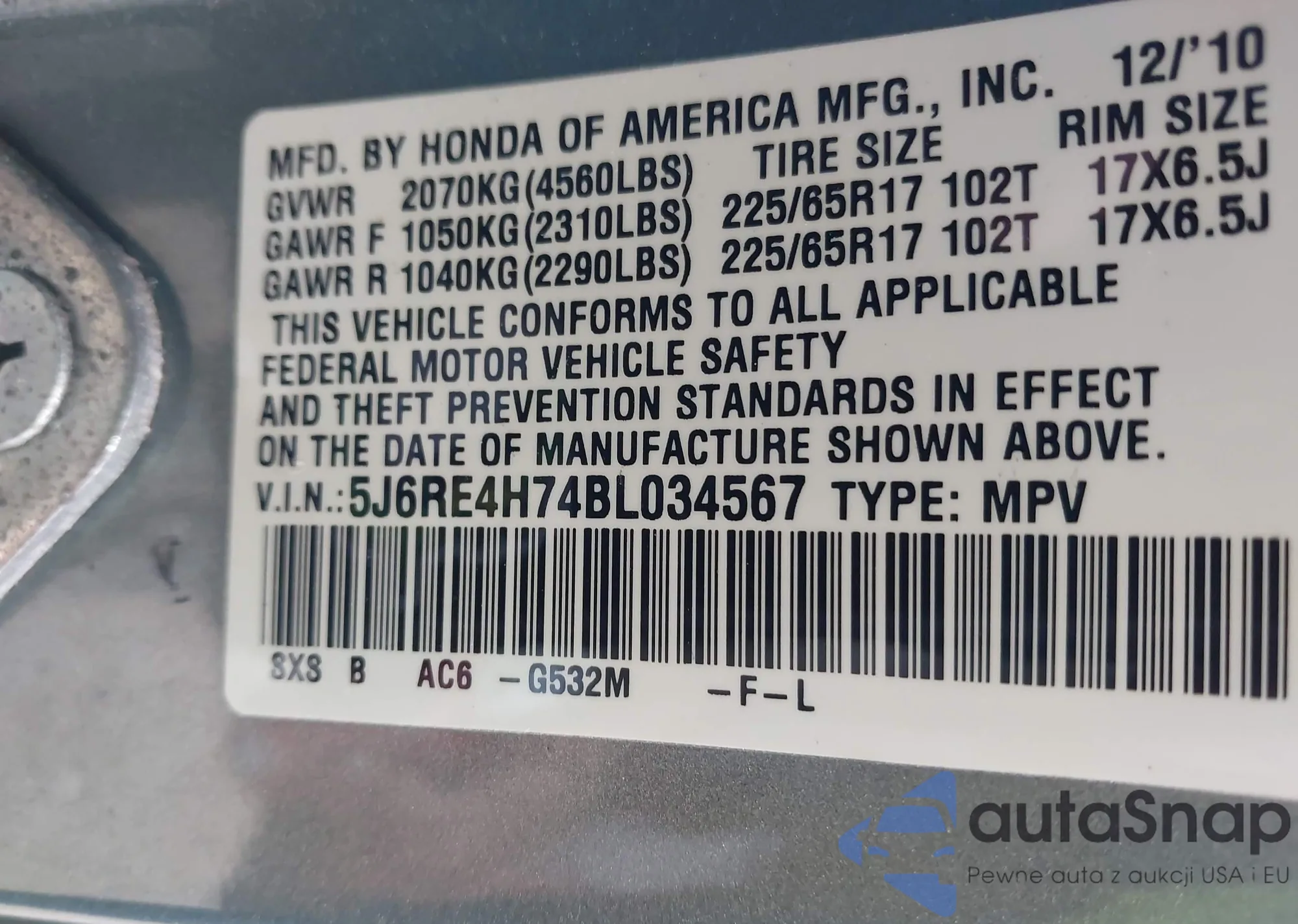 • VIN 5J6RE4H74BL034567