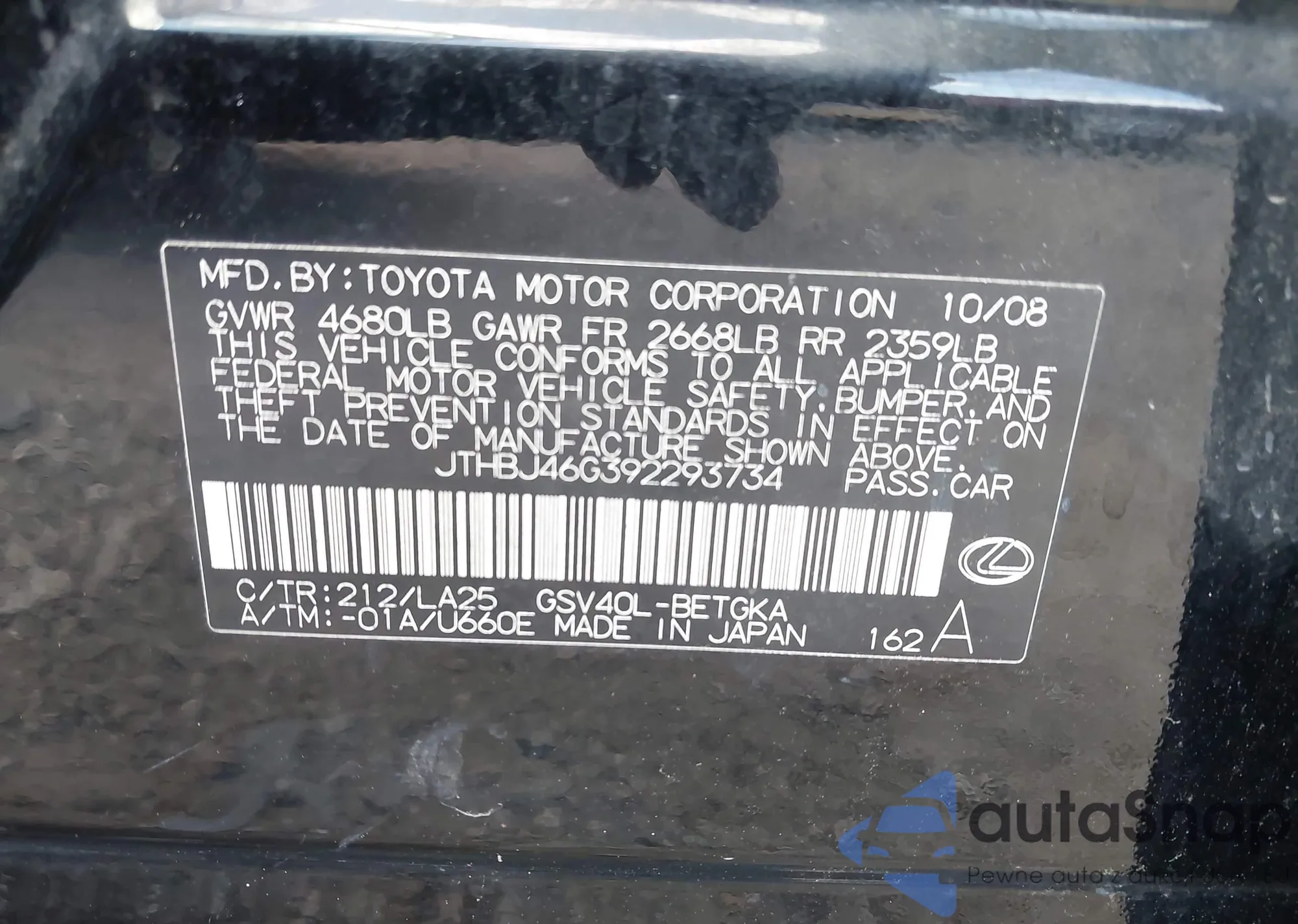 LOT: 43446030 VIN: 1HGCM56447A001182
