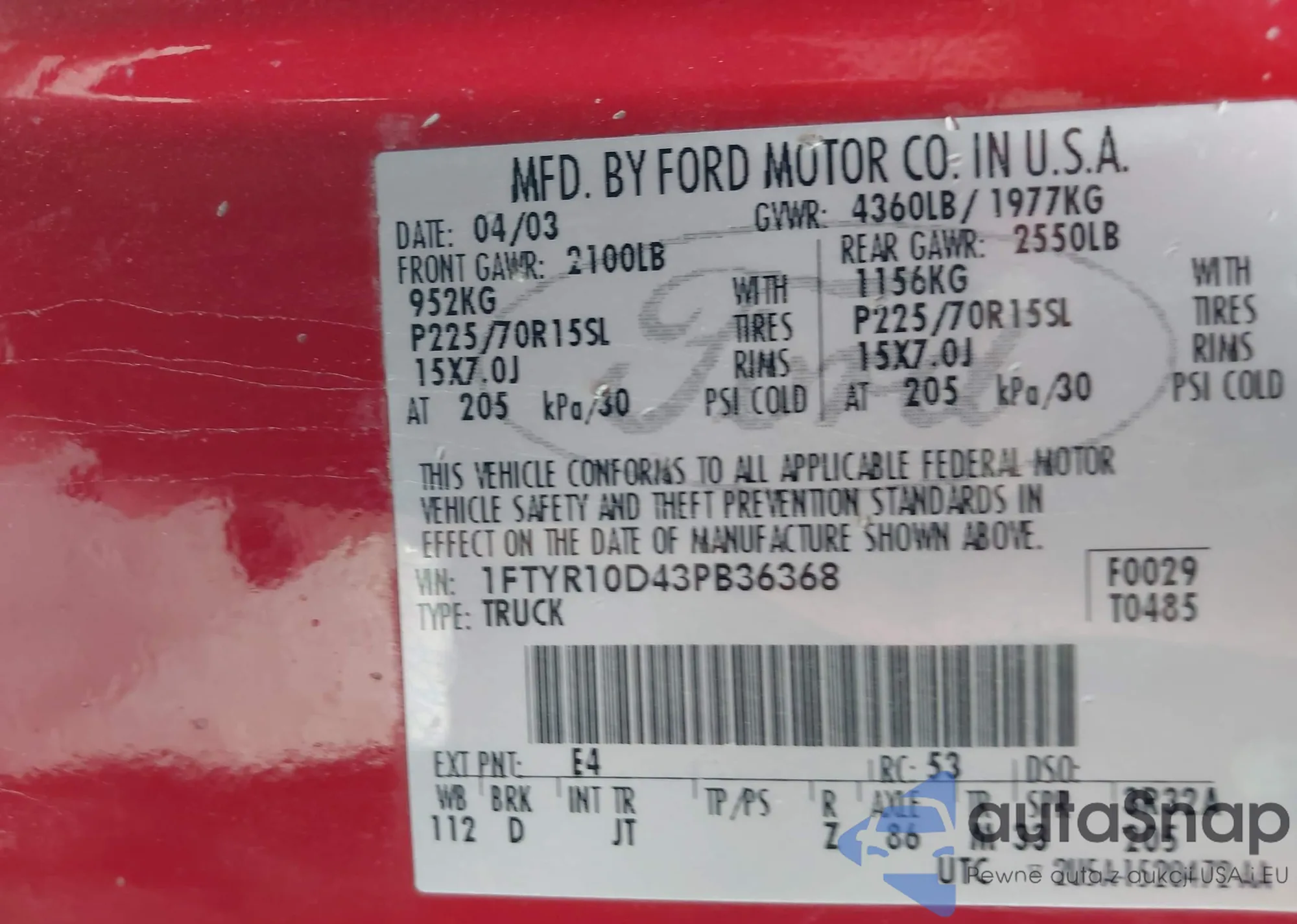 LOT: 43397550 VIN: 1FTYR10D43PB36368
