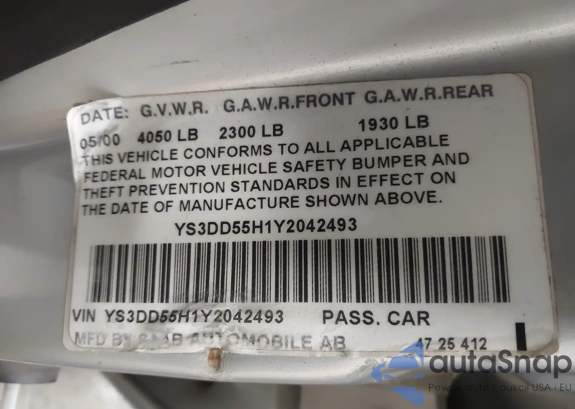 2000 Saab 9-3 from USA, damaged, VIN YS3DD55H1Y2042493