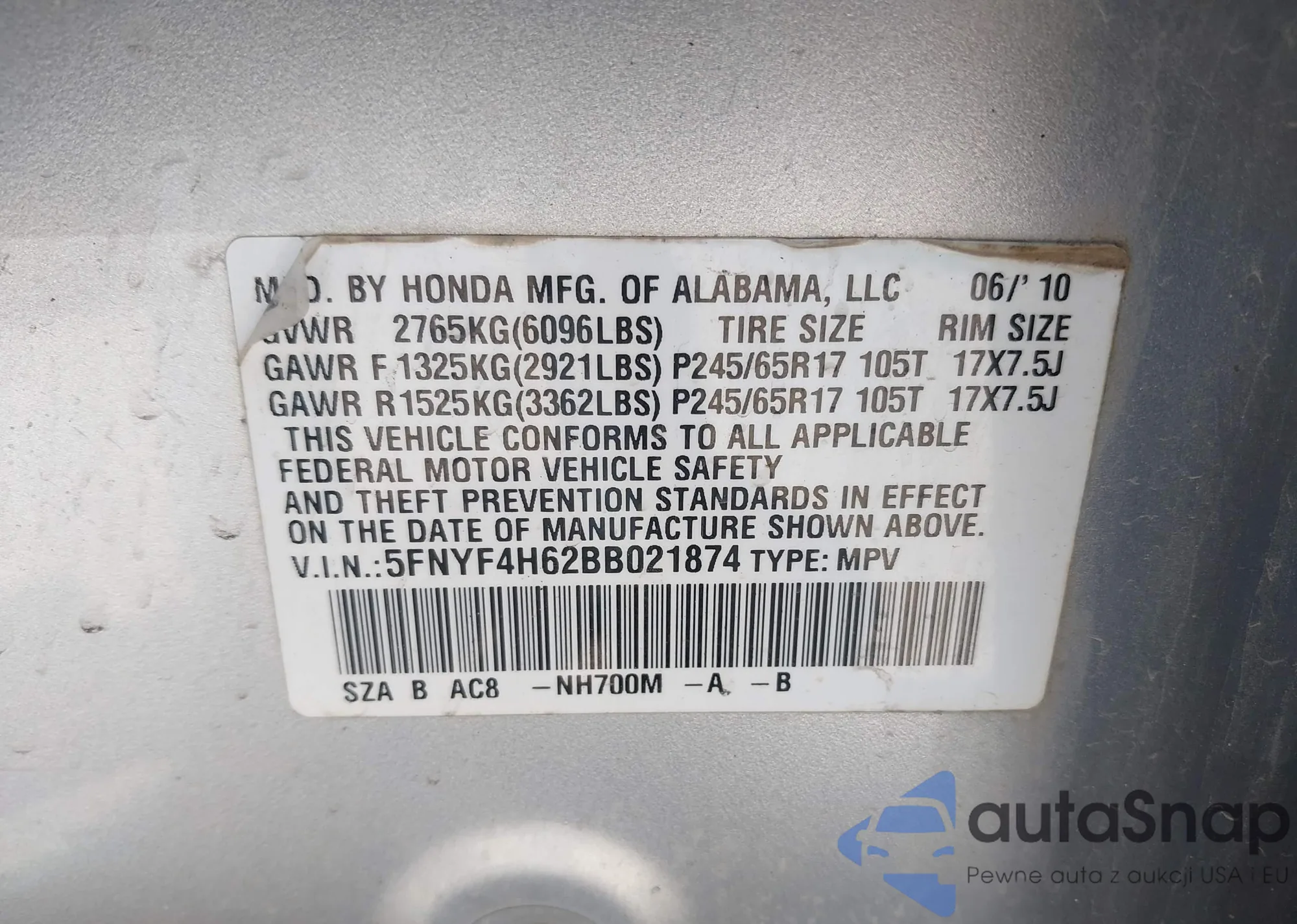 • VIN 5FNYF4H62BB021874