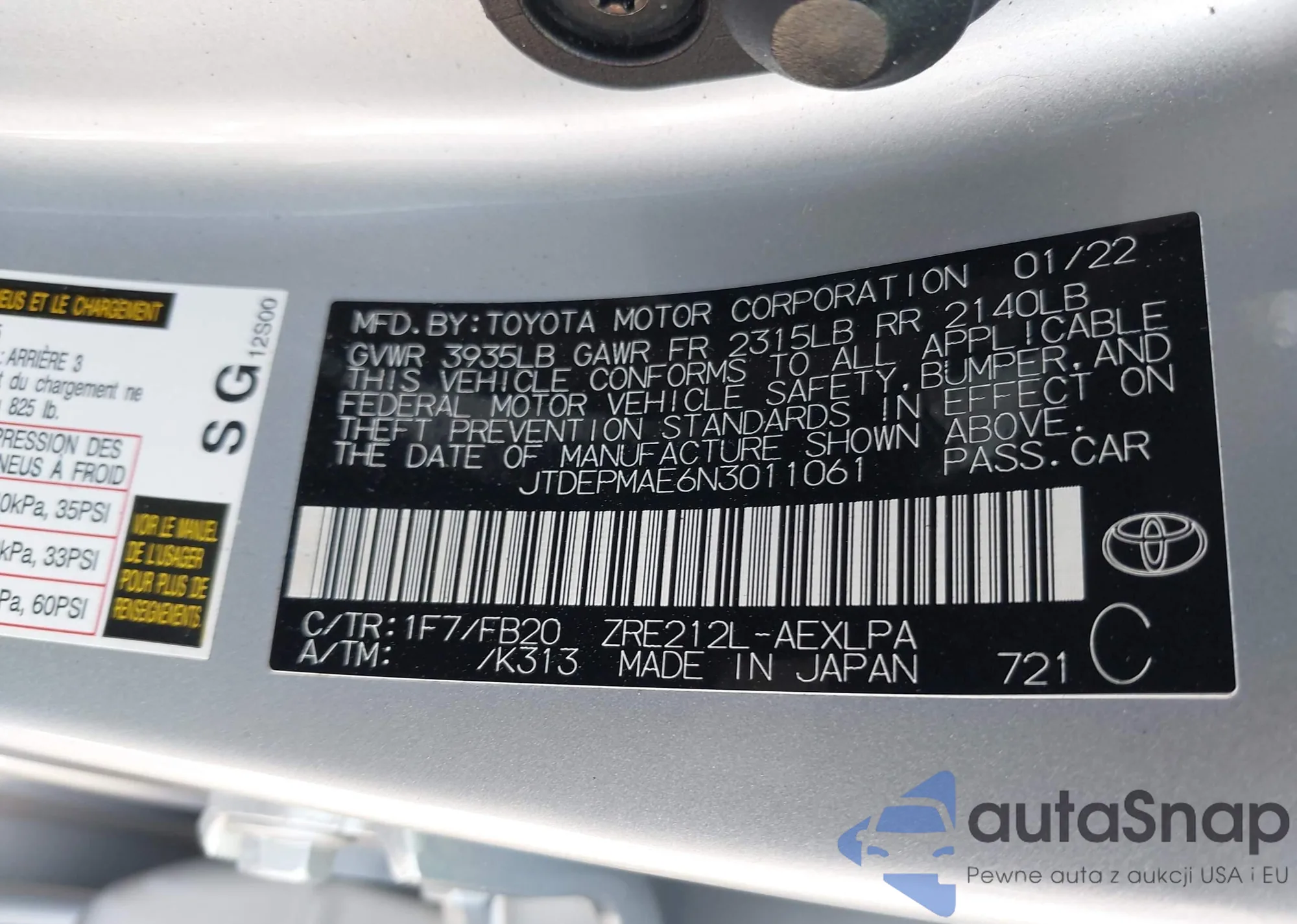 LOT: 43249413 VIN: JTDEPMAE6N3011061