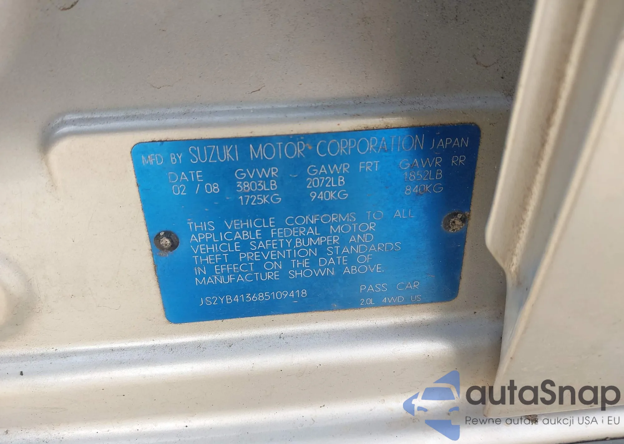 LOT: 43753445 VIN: JS2YB413685109418