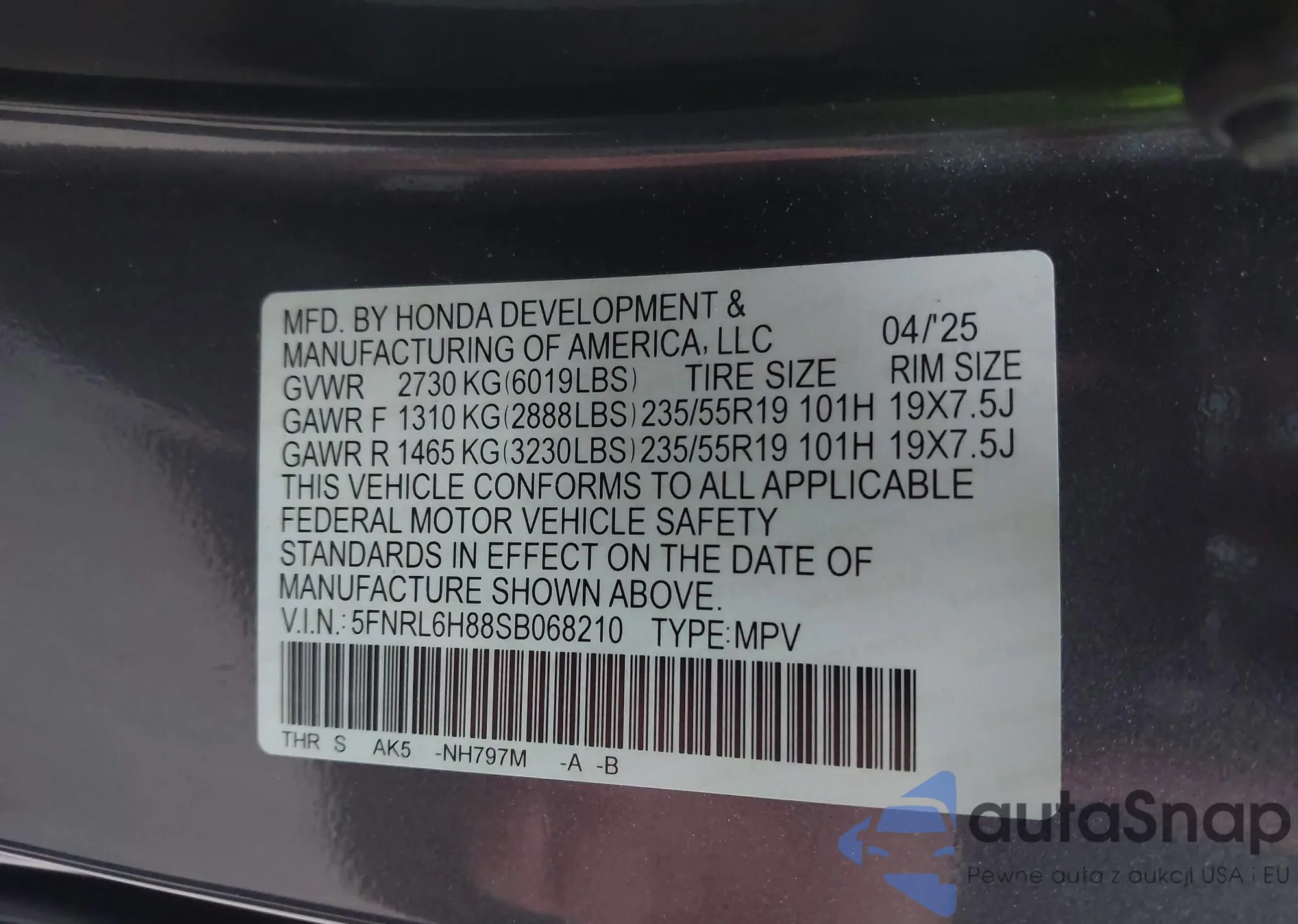• VIN 5FNRL6H88SB068210