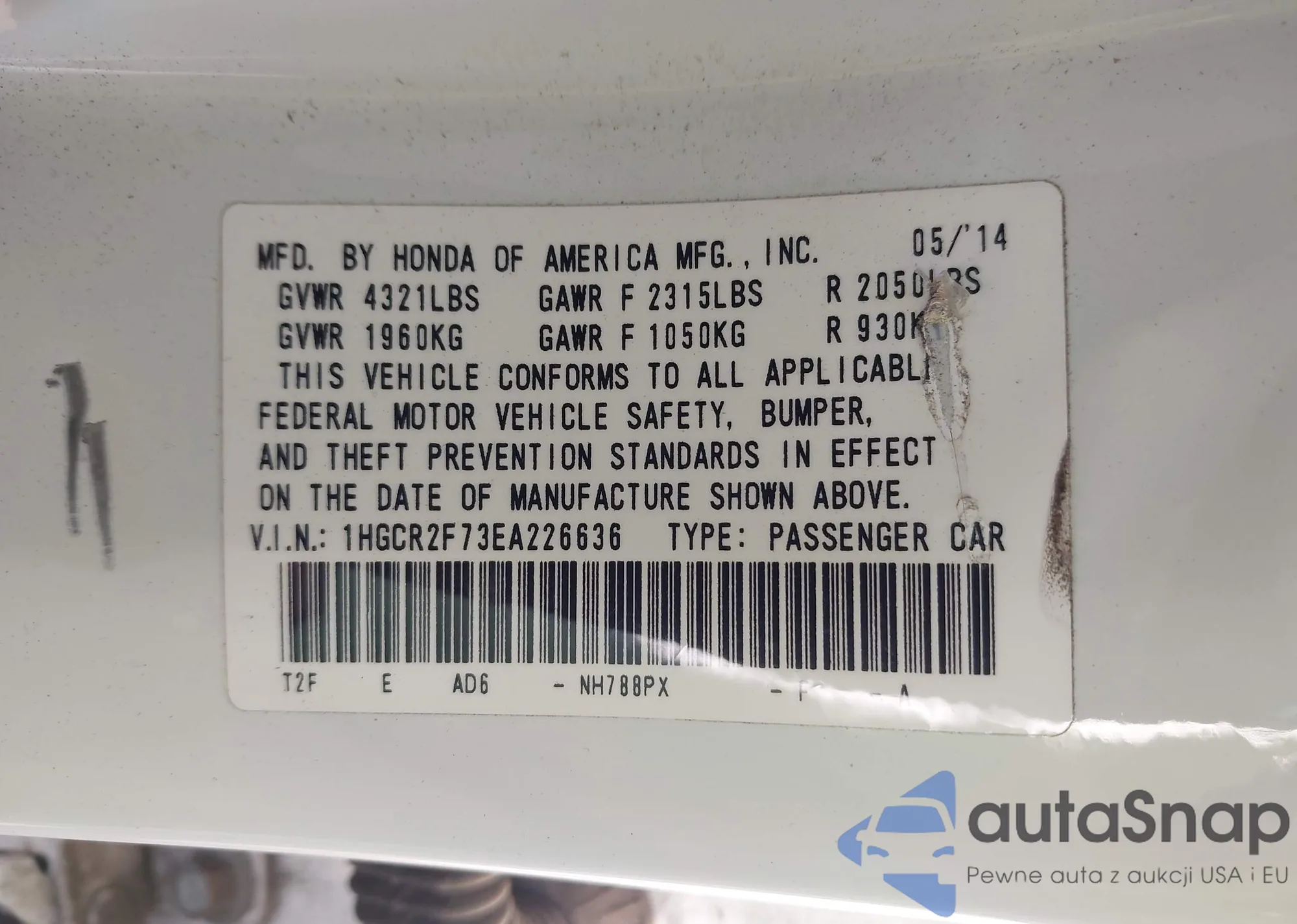 LOT: 43118341 VIN: 1HGCR2F73EA226636