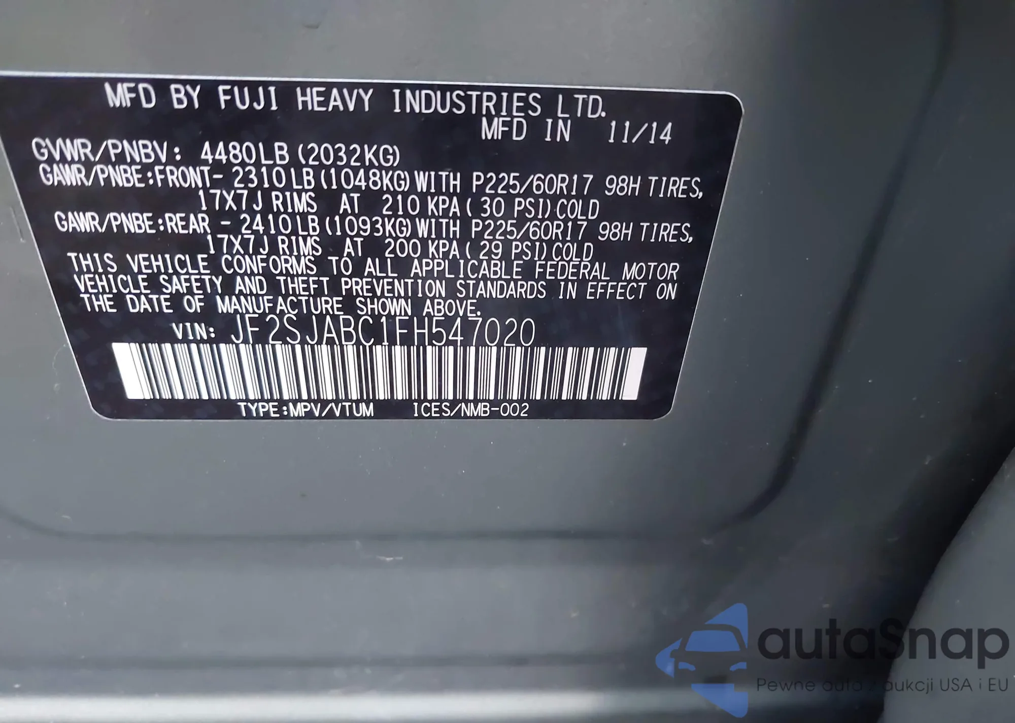 LOT: 43704493 VIN: JF2SJABC1FH547020