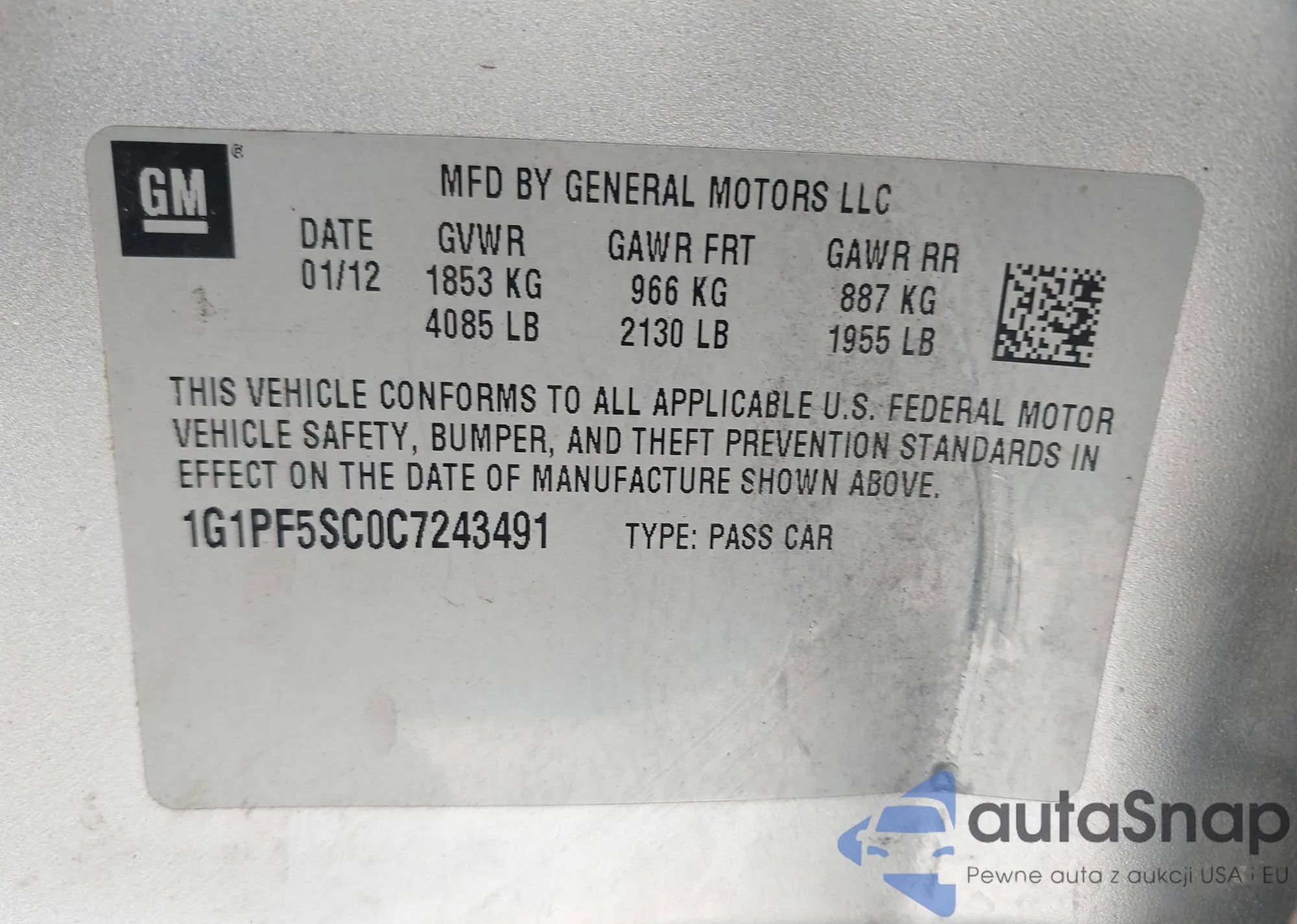 LOT: 43482665 VIN: 1G1PF5SC0C7243491