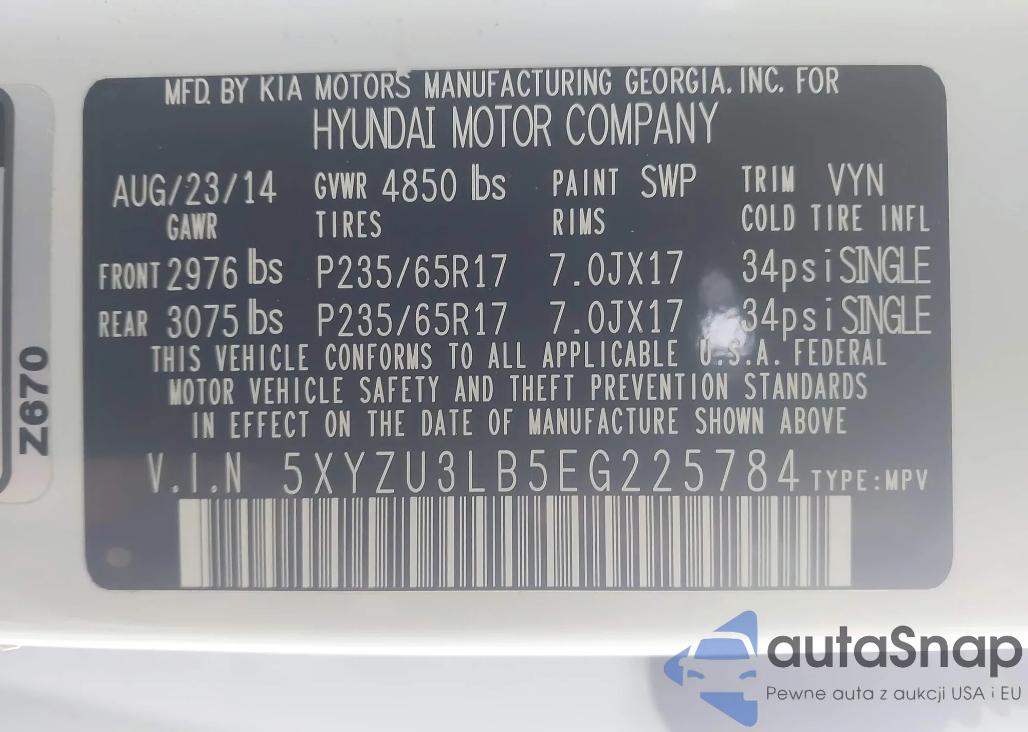 • VIN 5XYZU3LB5EG225784