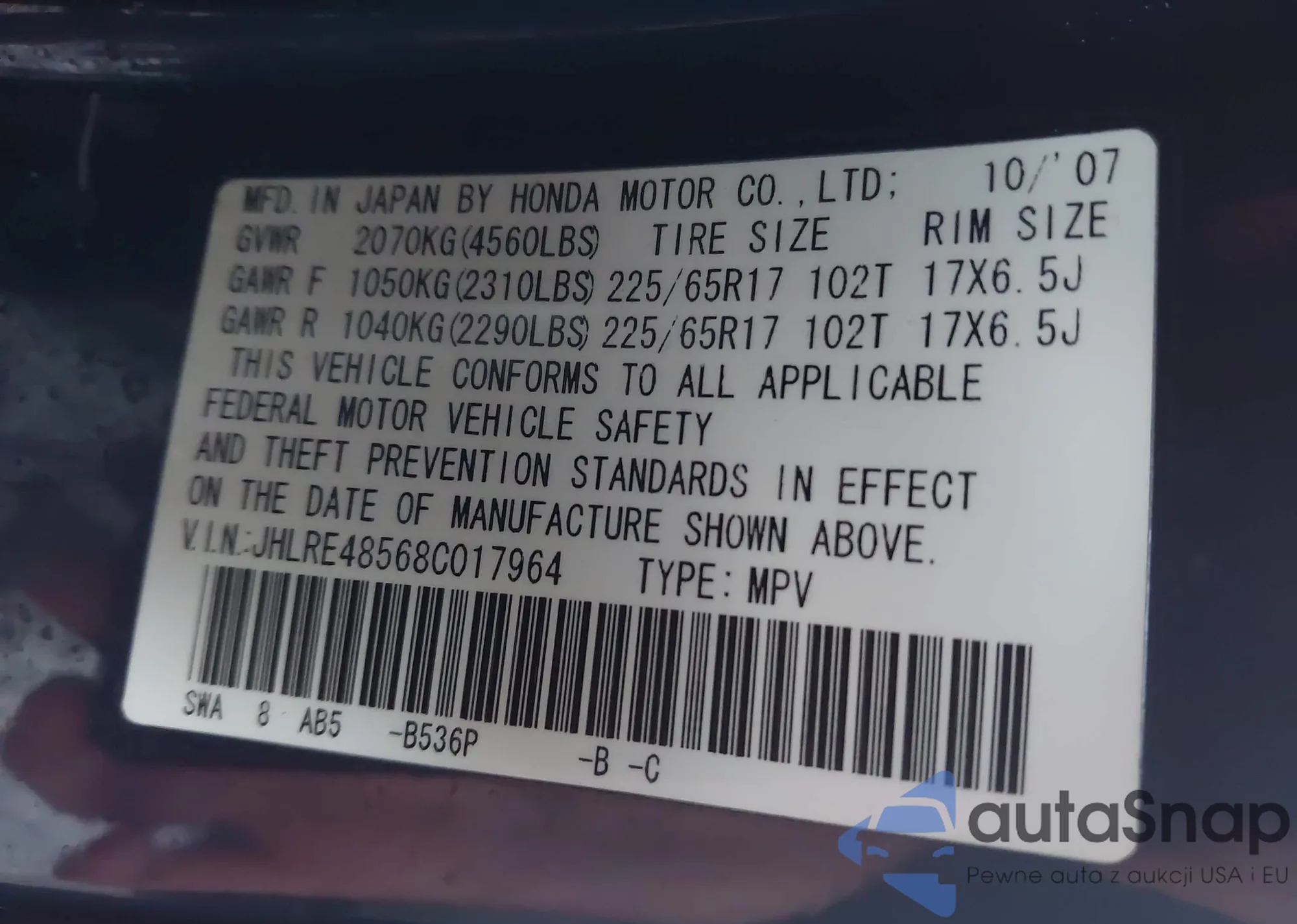 • VIN JHLRE48568C017964