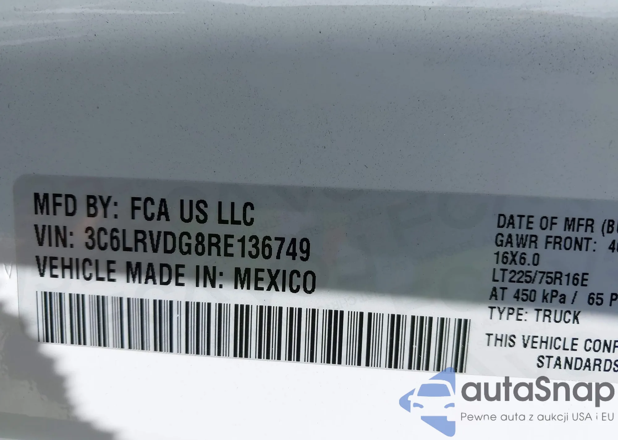 LOT: 43131420 VIN: 3C6LRVDG8RE136749