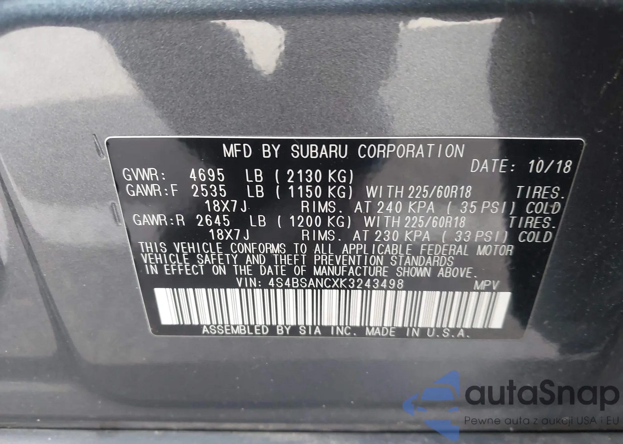 LOT: 43660442 VIN: 4S4BSANCXK3243498