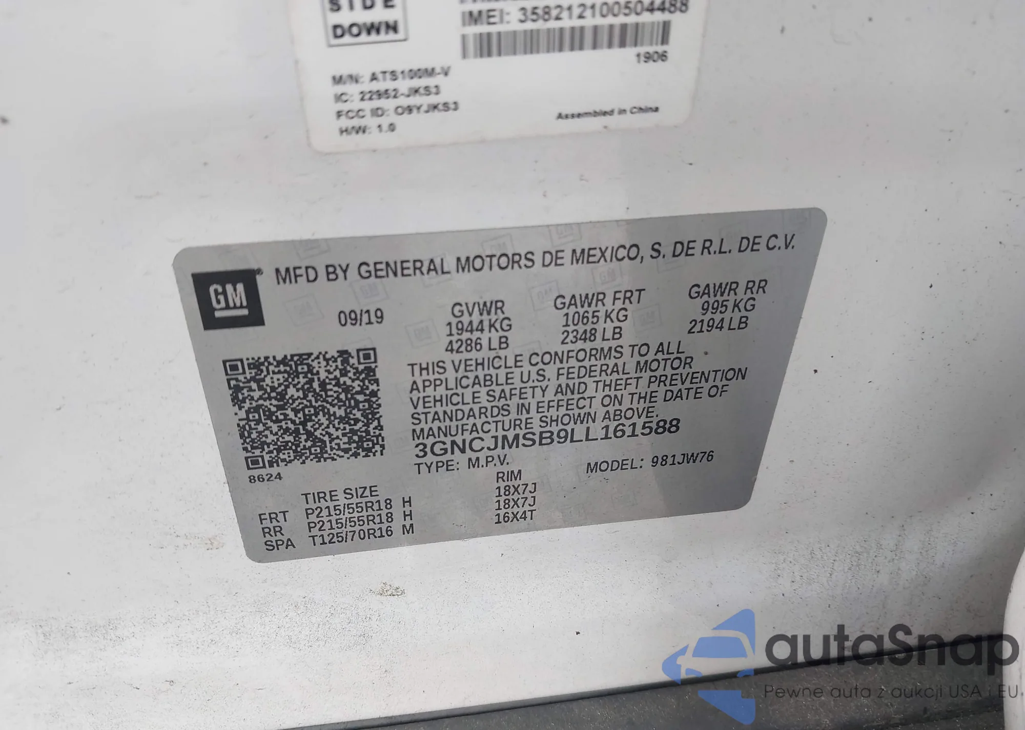 • VIN 3GNCJMSB9LL161588