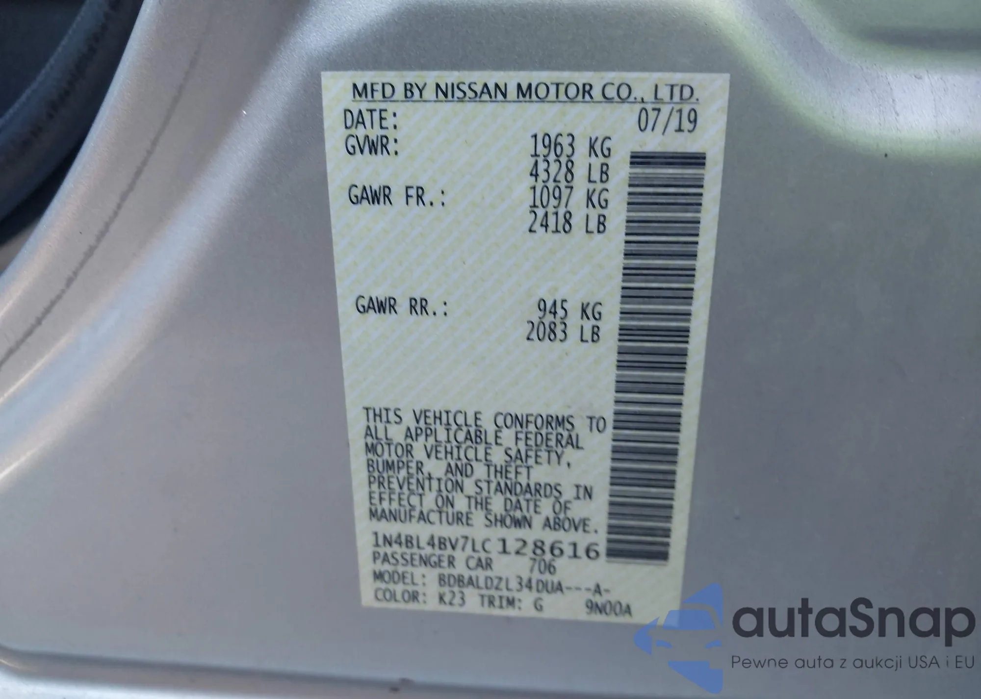 LOT: 43438680 VIN: 1N4BL4BV7LC128616