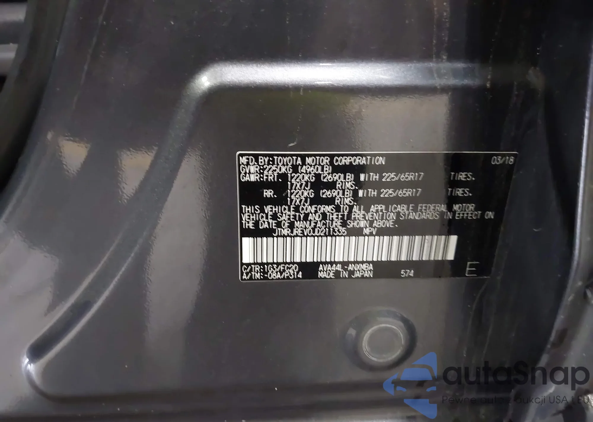 LOT: 43505620 VIN: JTMRJREV0JD211335