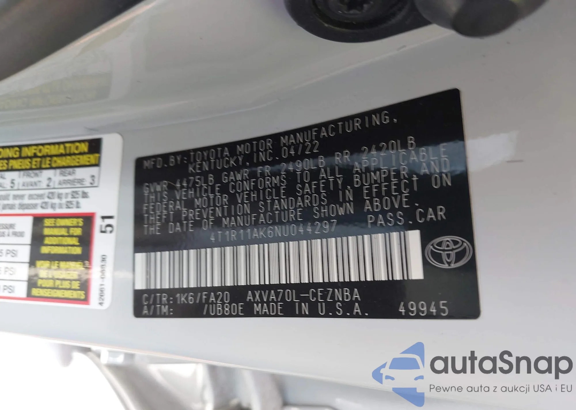 • VIN 4T1R11AK6NU044297