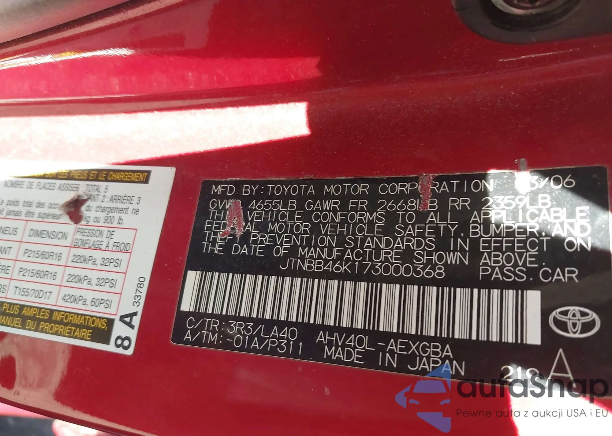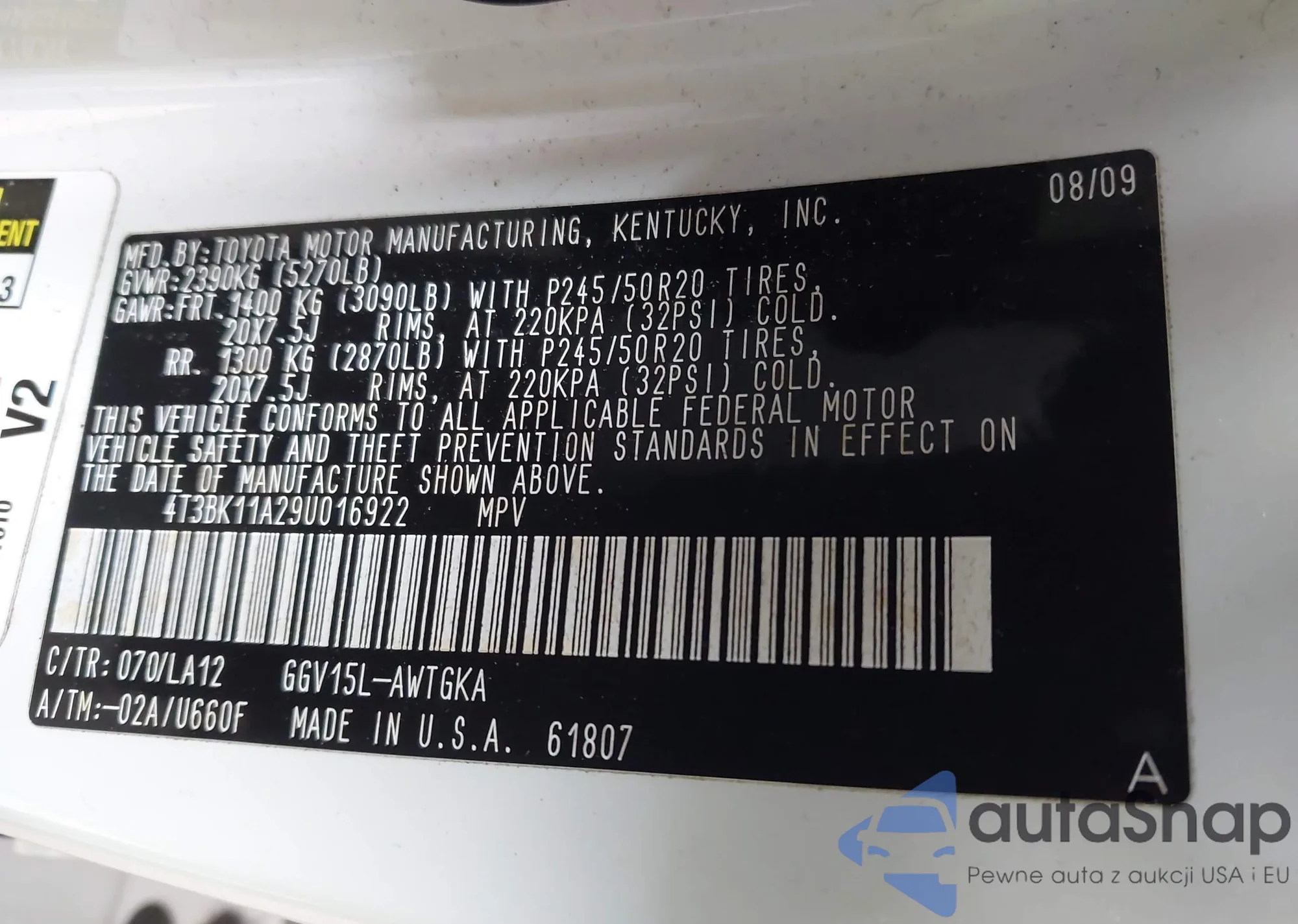 LOT: 43708253 VIN: 4T3BK11A29U016922