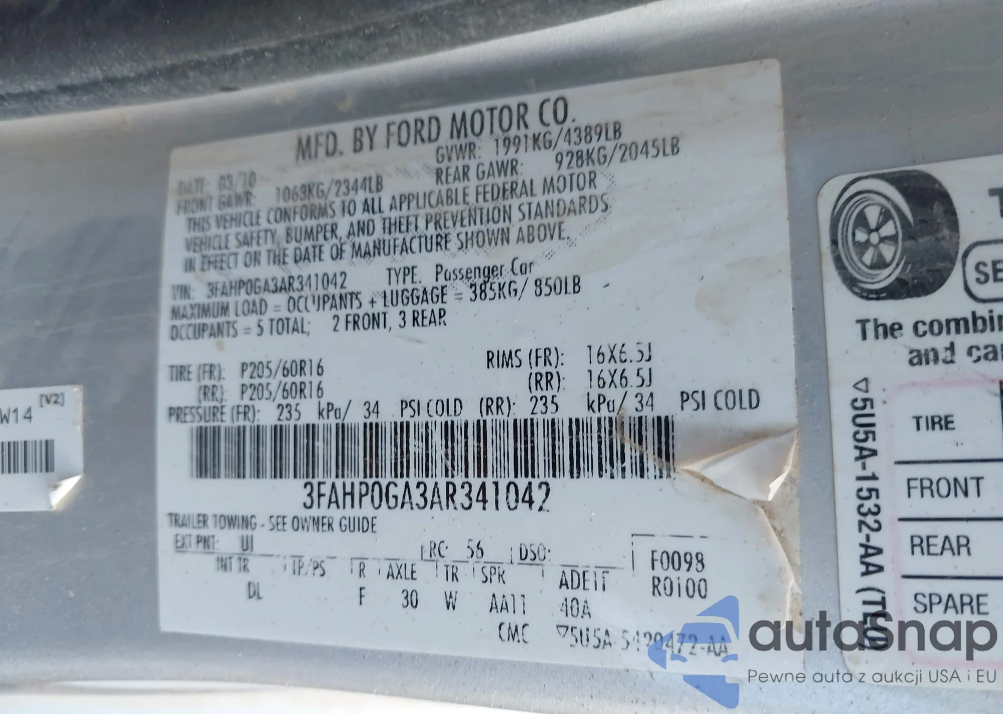• VIN 3FAHP0GA3AR341042