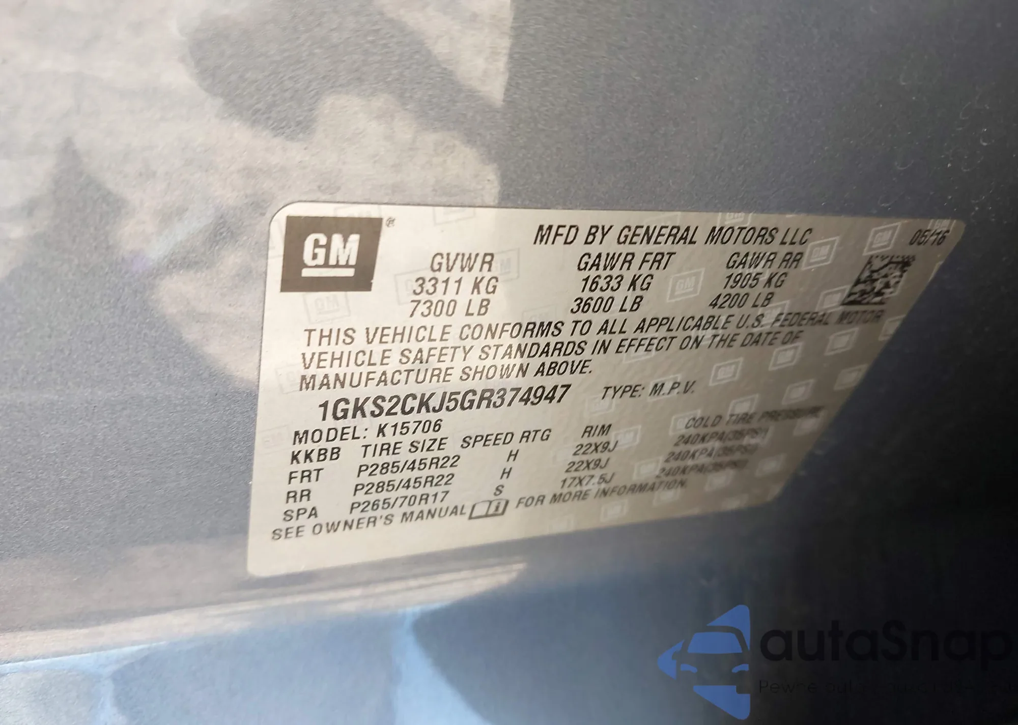 LOT: 43456318 VIN: 1GKS2CKJ5GR374947