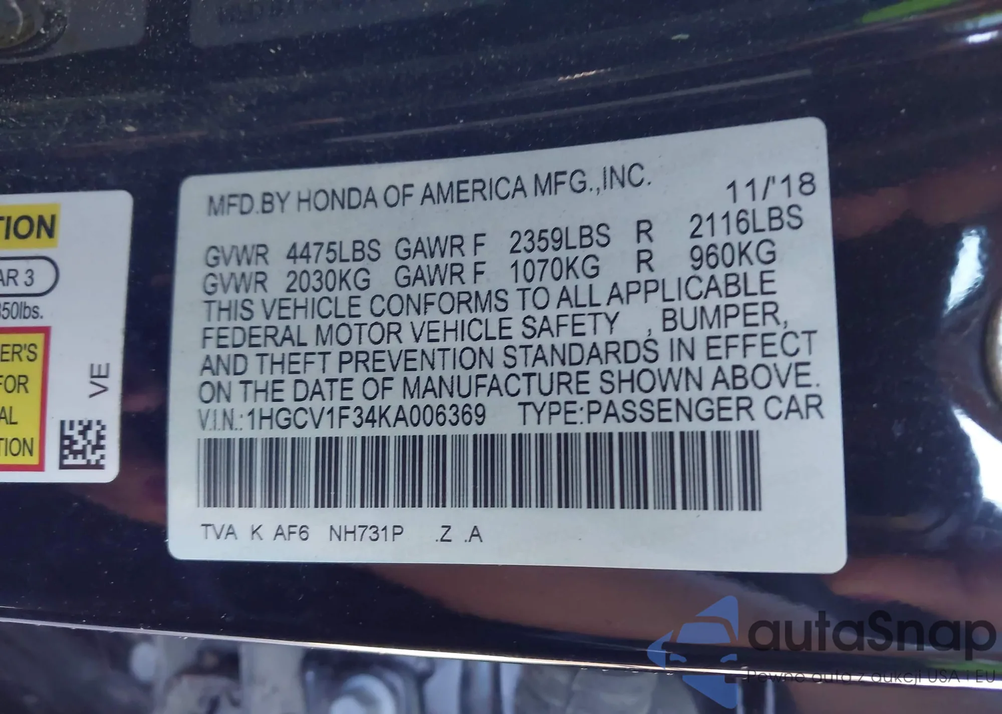 • VIN 1HGCV1F34KA006369
