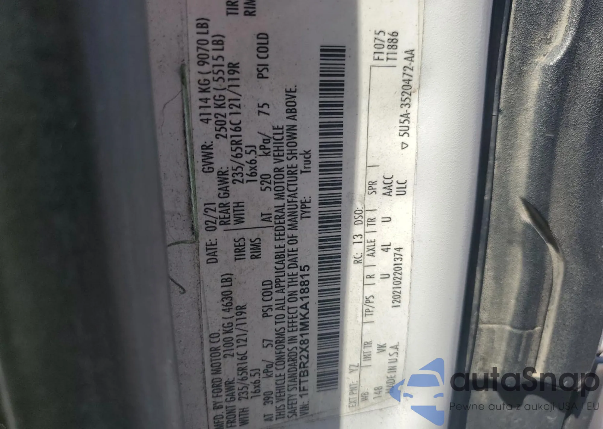 LOT: 86586715 VIN: 1FTBR2X81MKA18815