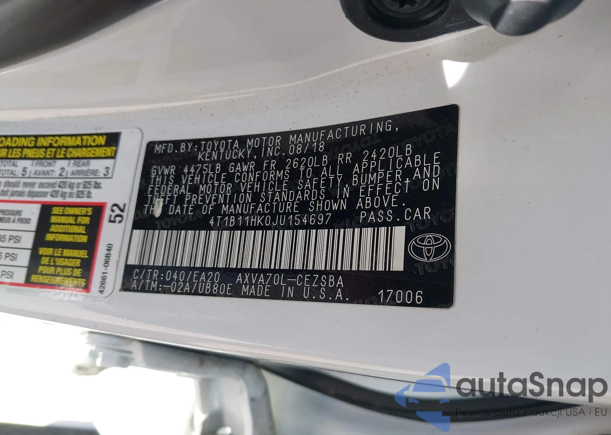 LOT: 43488791 VIN: 4T1B11HK0JU154697