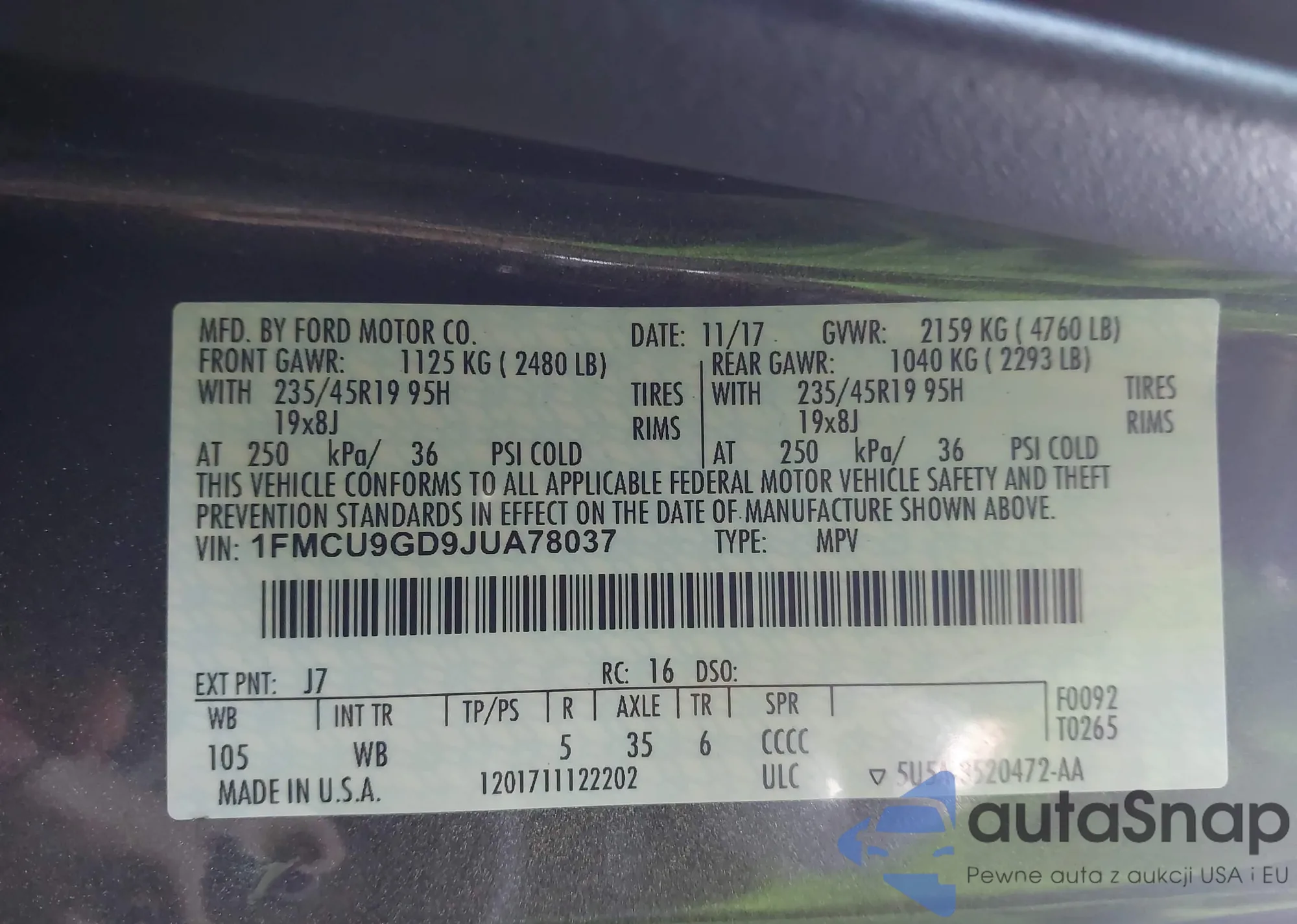 • VIN 1FMCU9GD9JUA78037