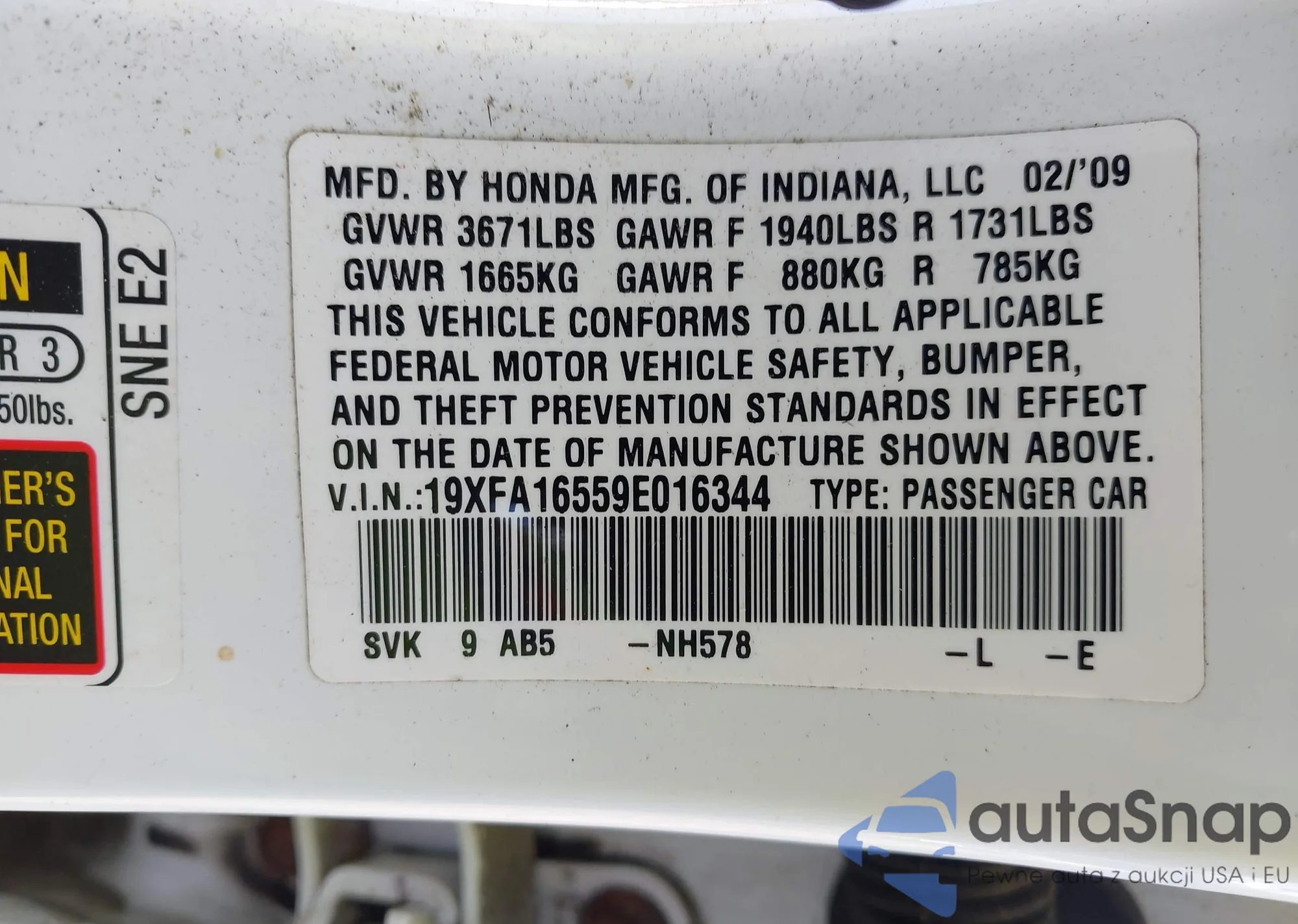 LOT: 43209250 VIN: 19XFA16559E016344