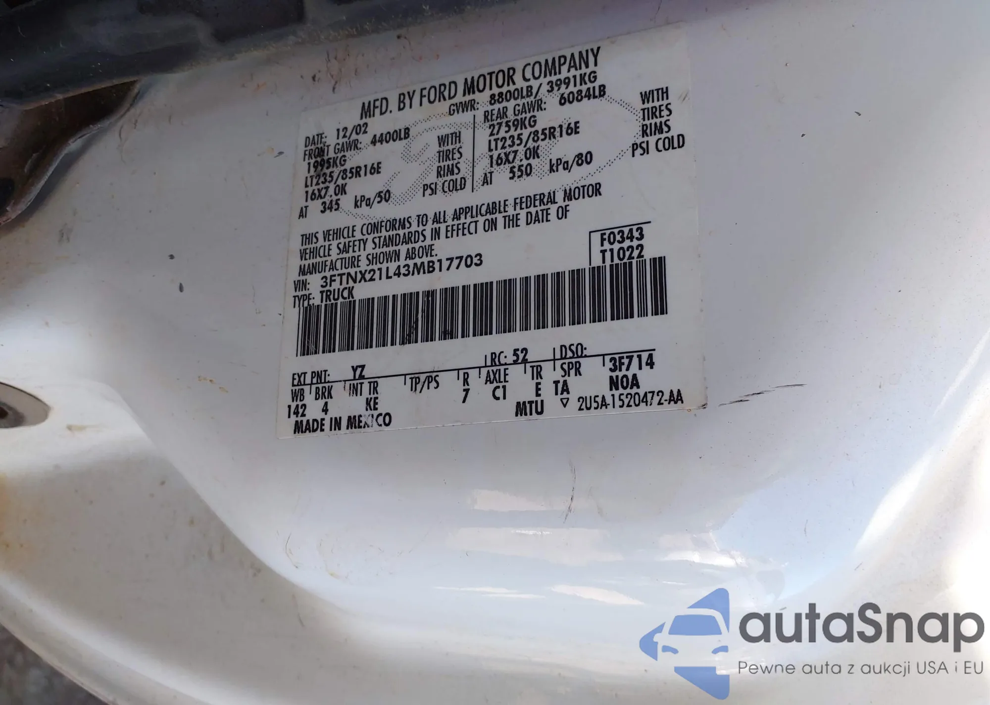 LOT: 43456896 VIN: 3FTNX21L43MB17703