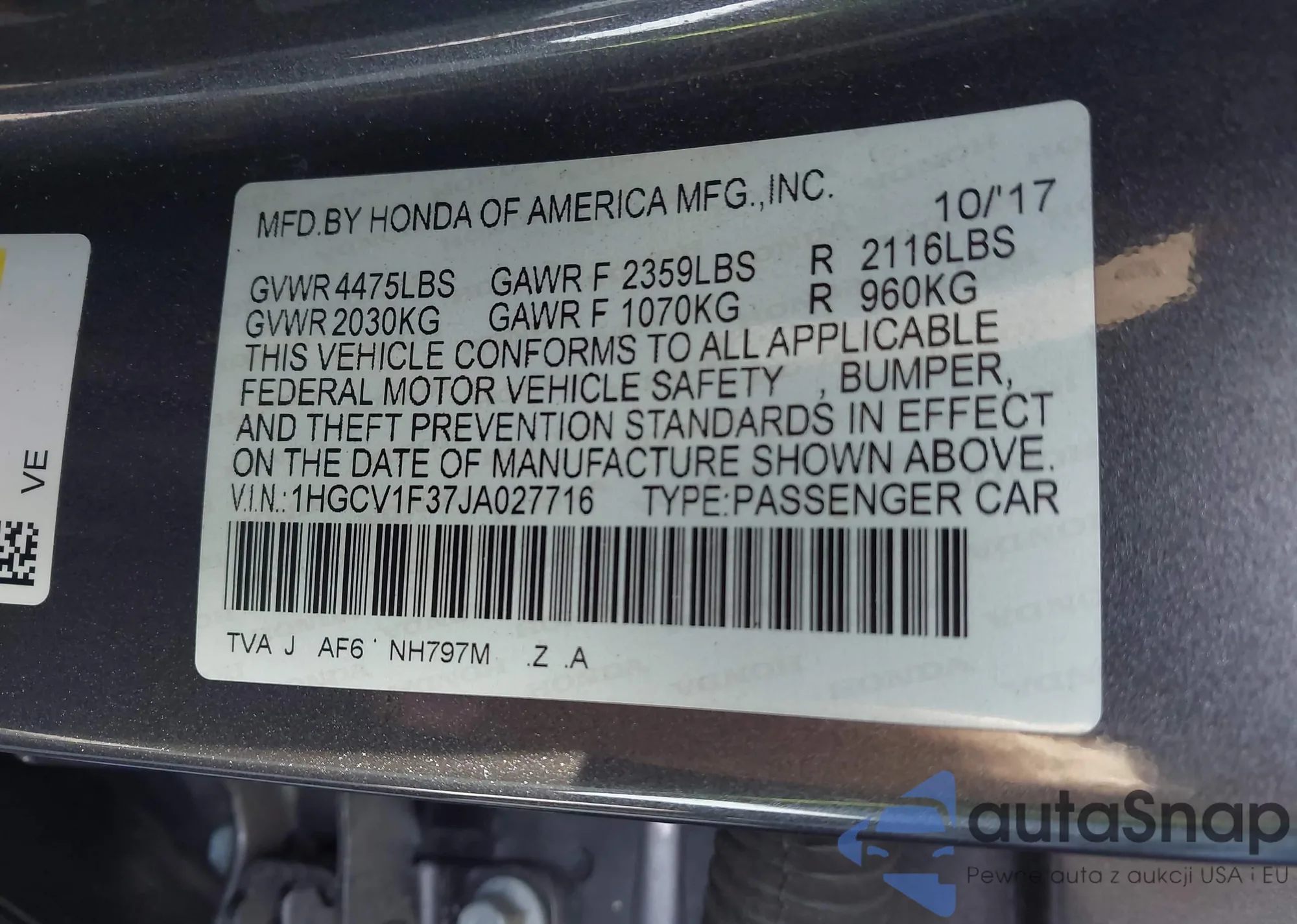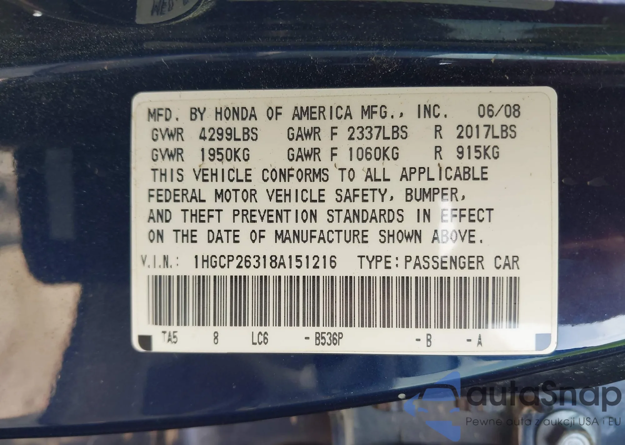 LOT: 43514314 VIN: 1HGCP26318A151216