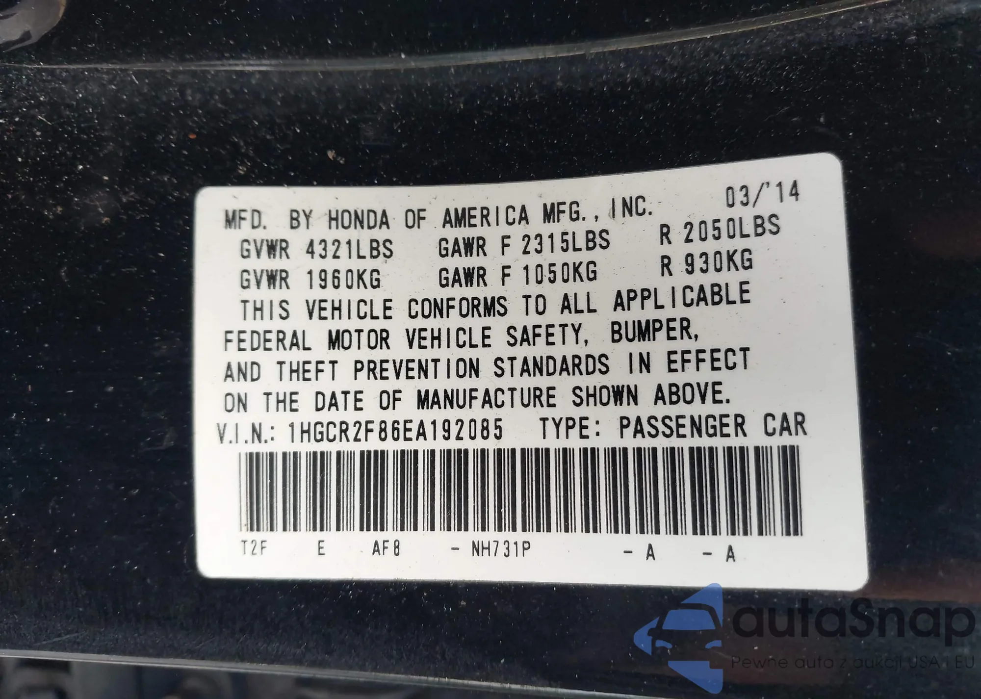 • VIN 1HGCR2F86EA192085