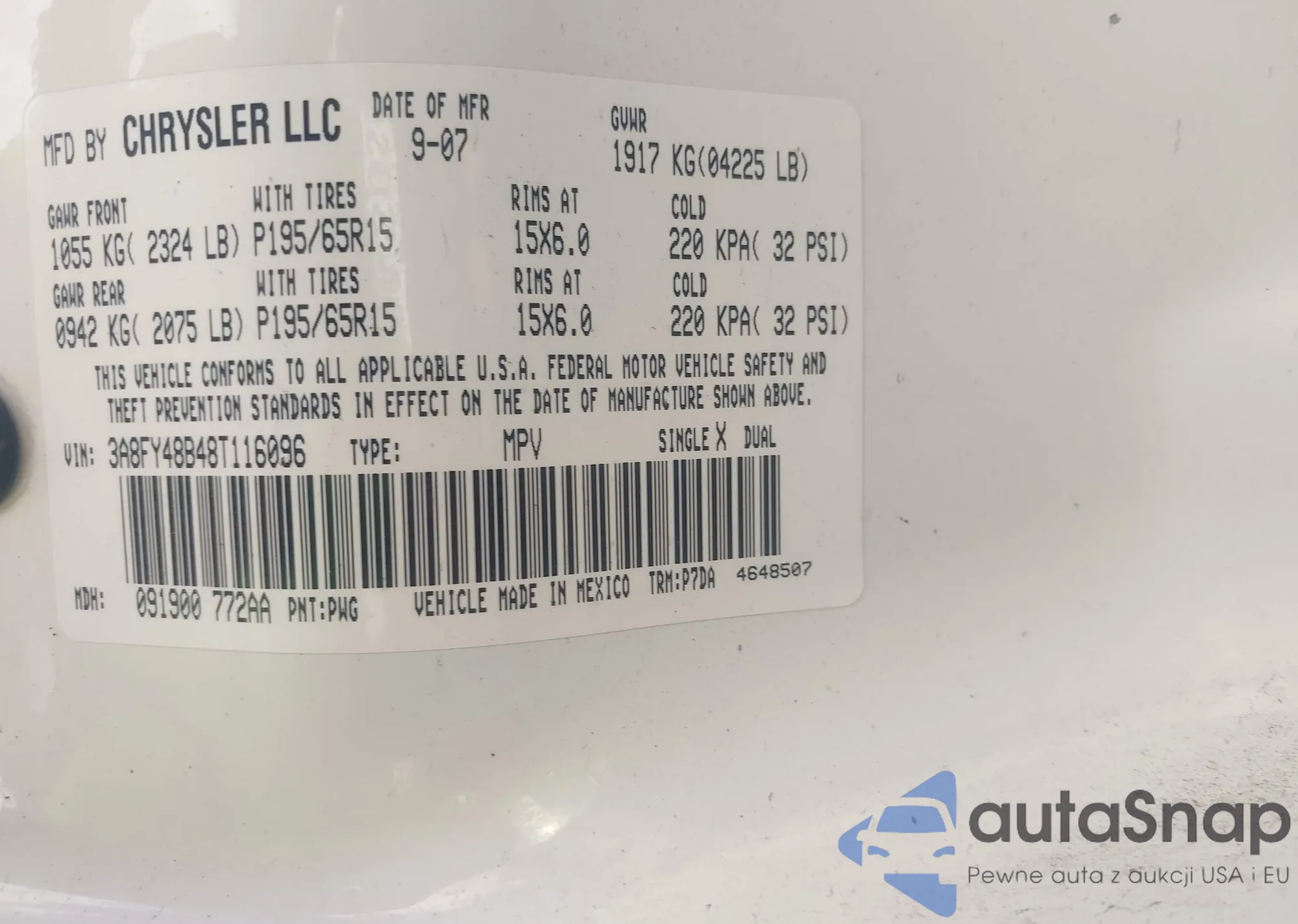 LOT: 43703653 VIN: 3A8FY48B48T116096