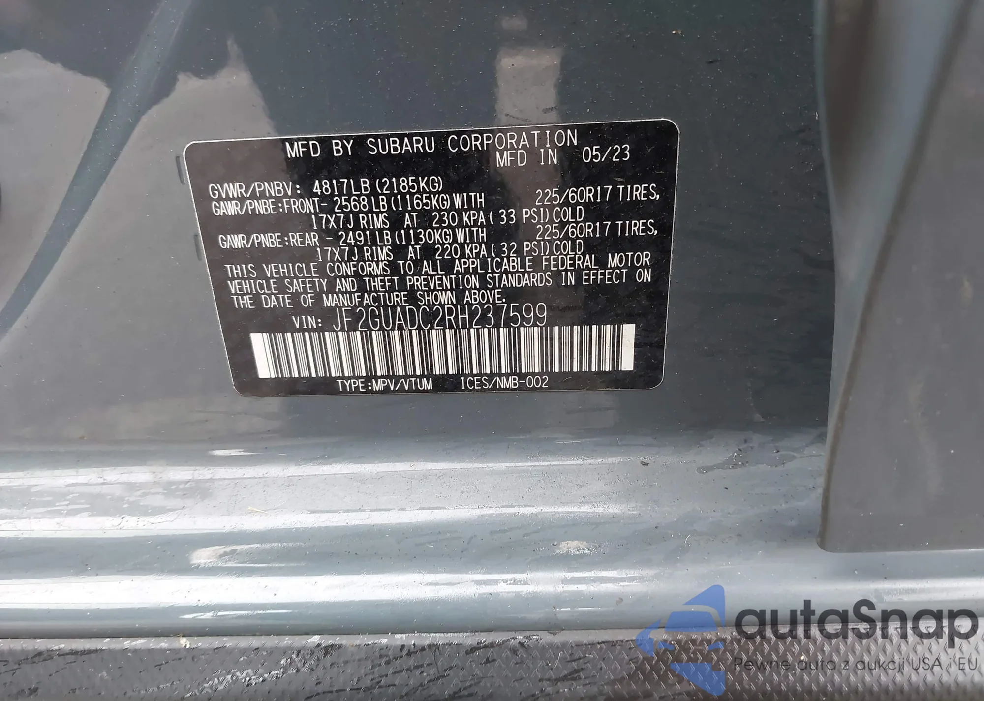 LOT: 43736672 VIN: JF2GUADC2RH237599