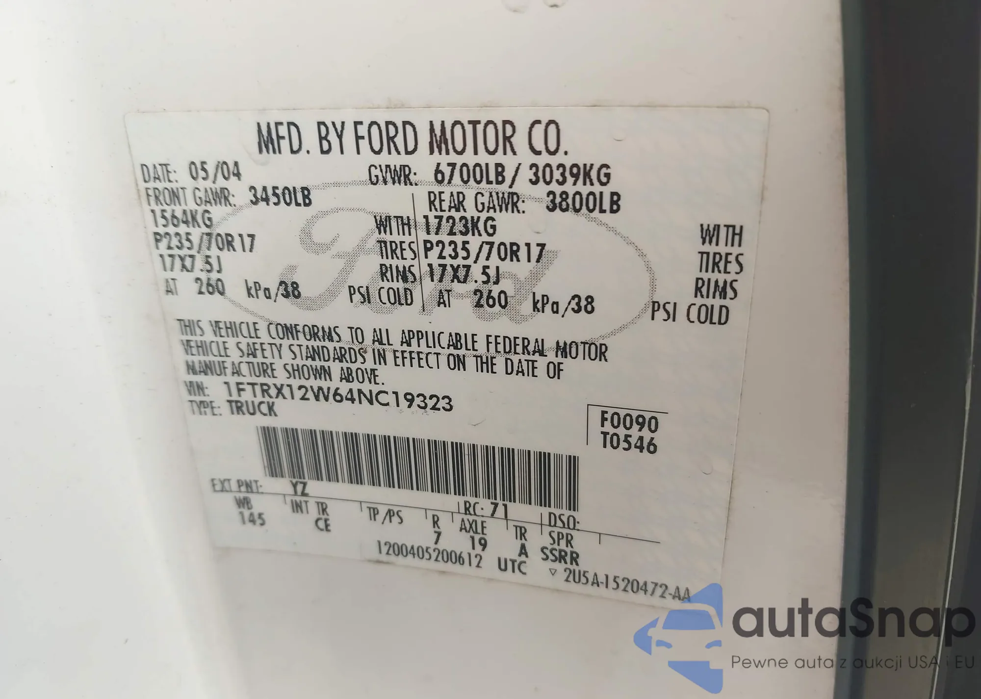 LOT: 43741315 VIN: 1FTRX12W64NC19323