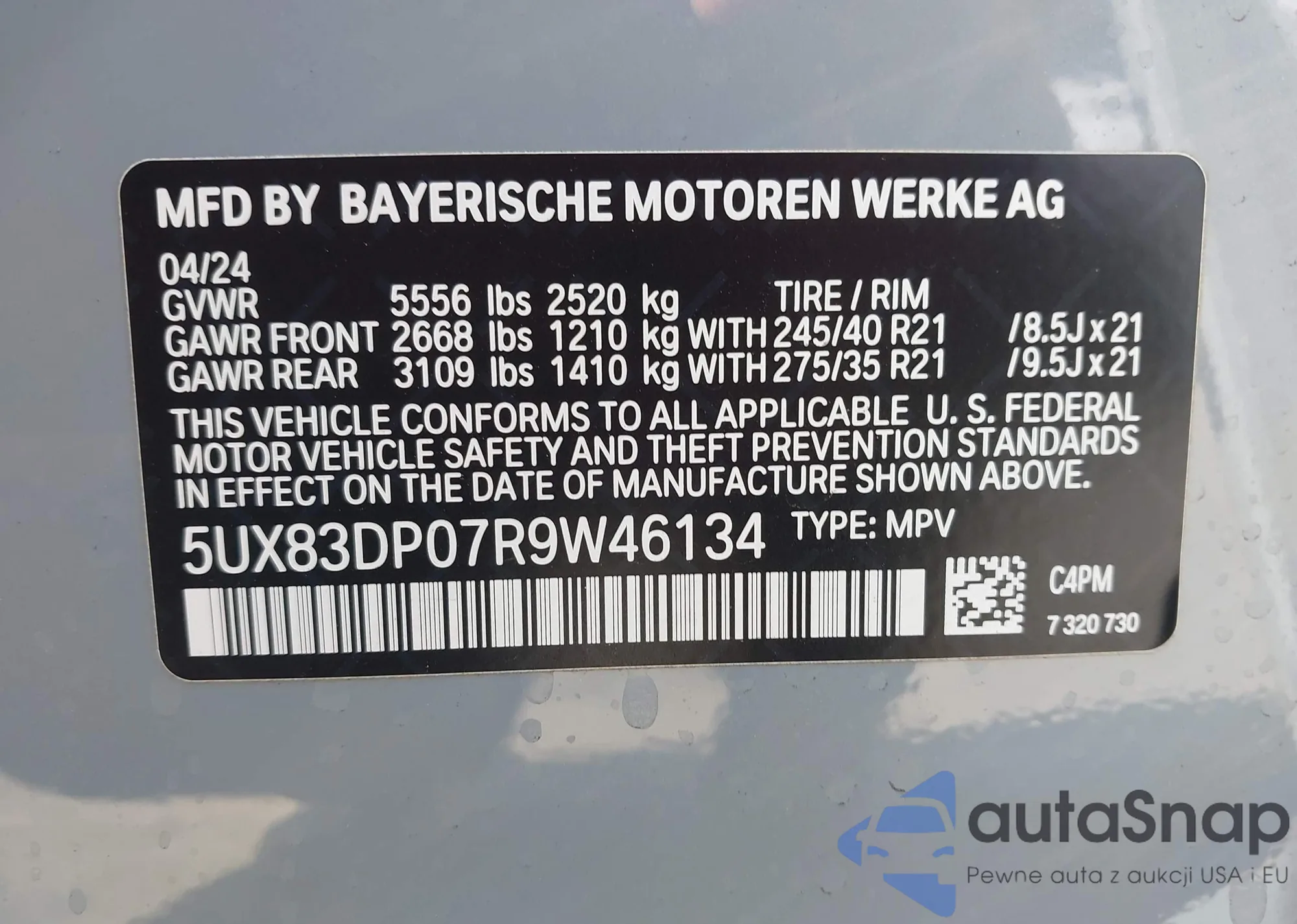 LOT: 42877519 VIN: 5UX83DP07R9W46134