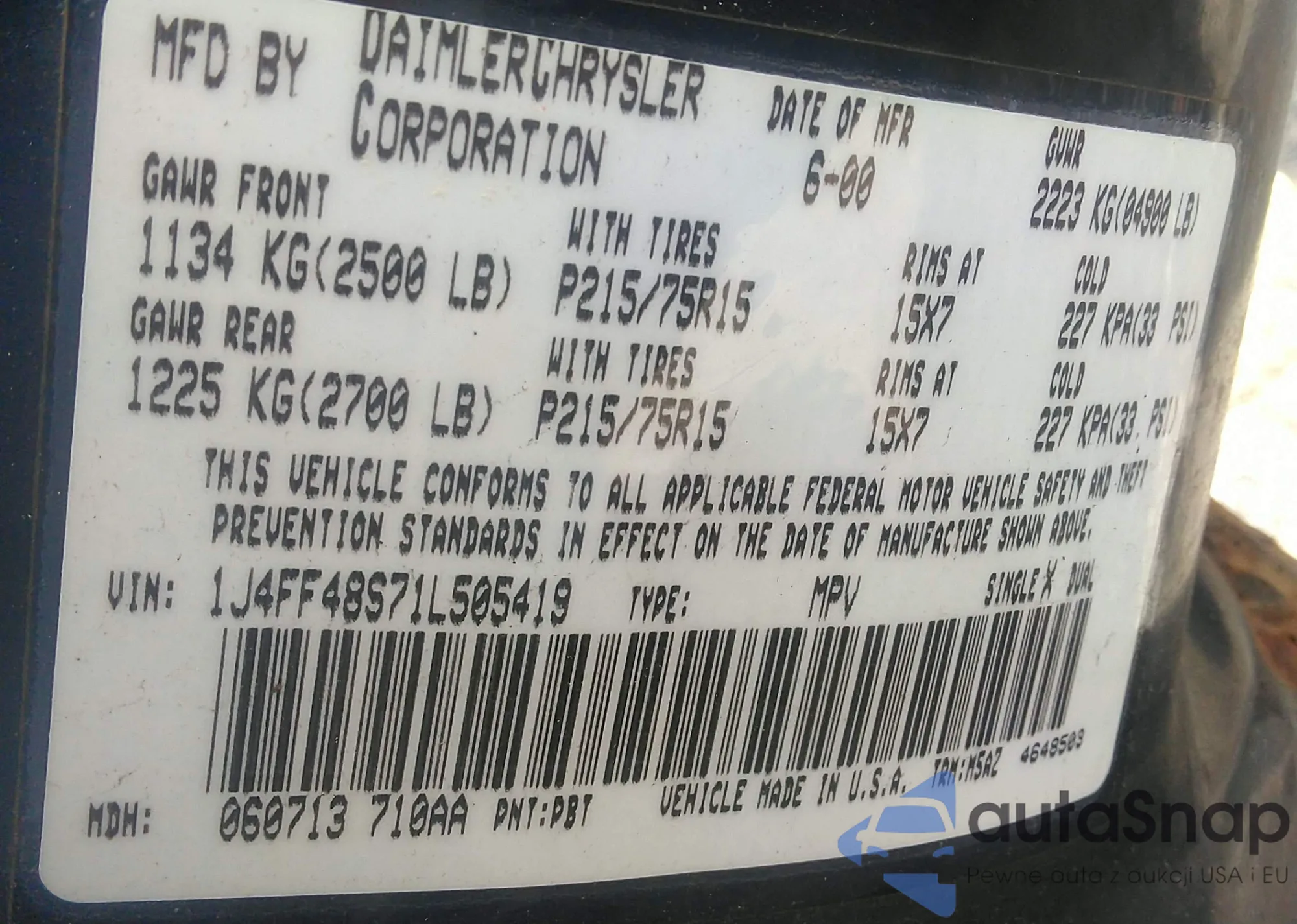 • VIN 1J4FF48S71L505419