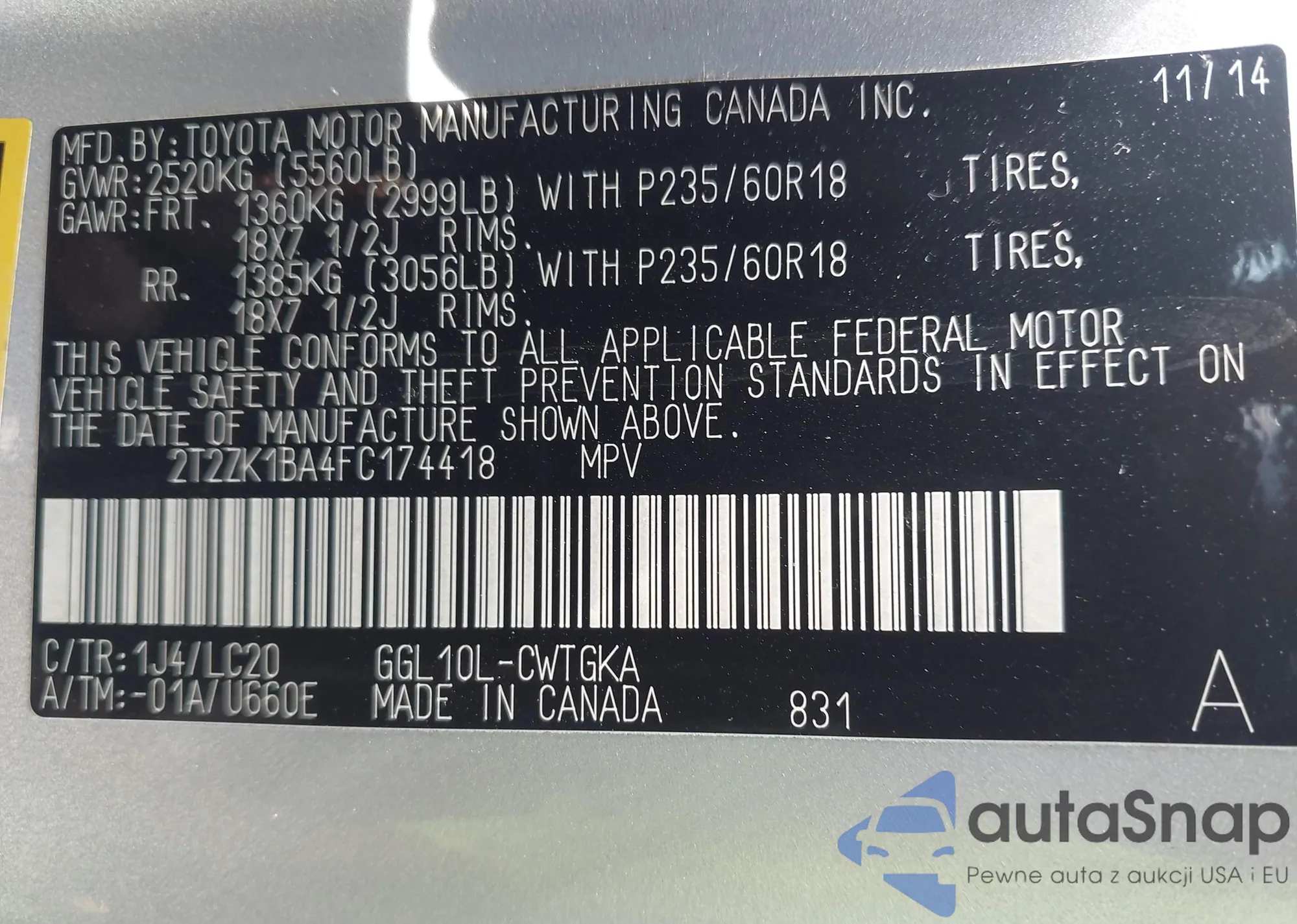 • VIN 2T2ZK1BA4FC174418