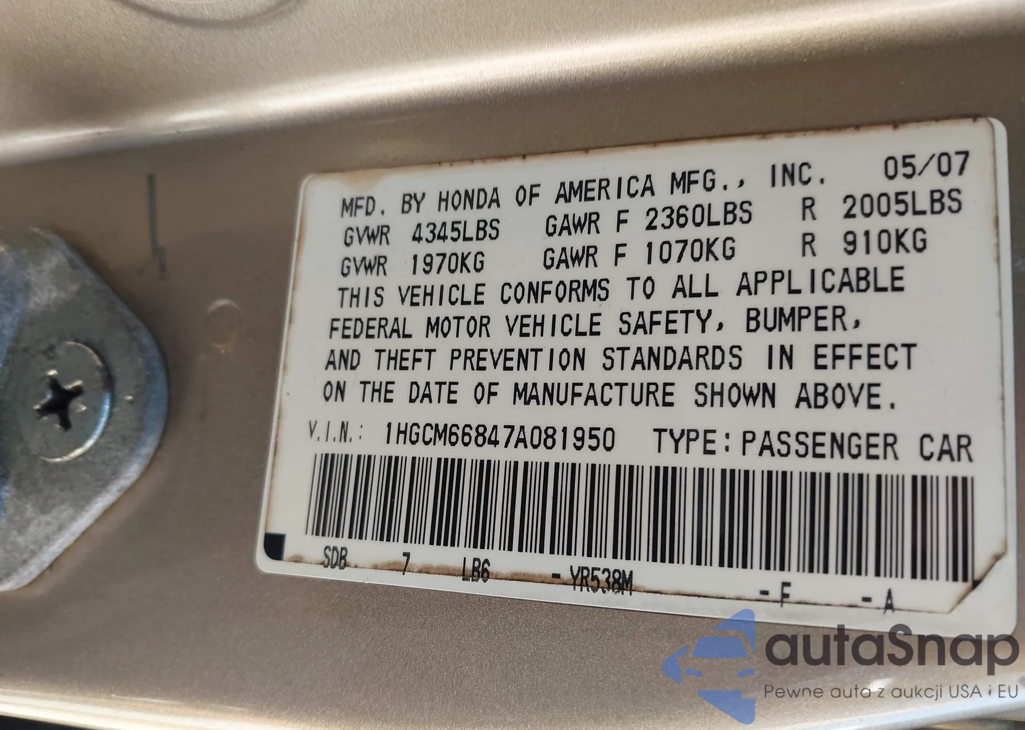 LOT: 43562294 VIN: 1HGCM66847A081950